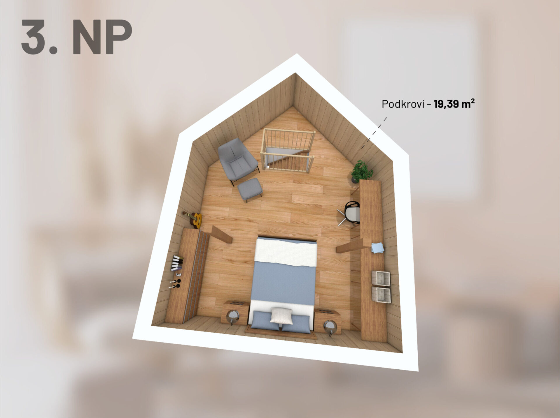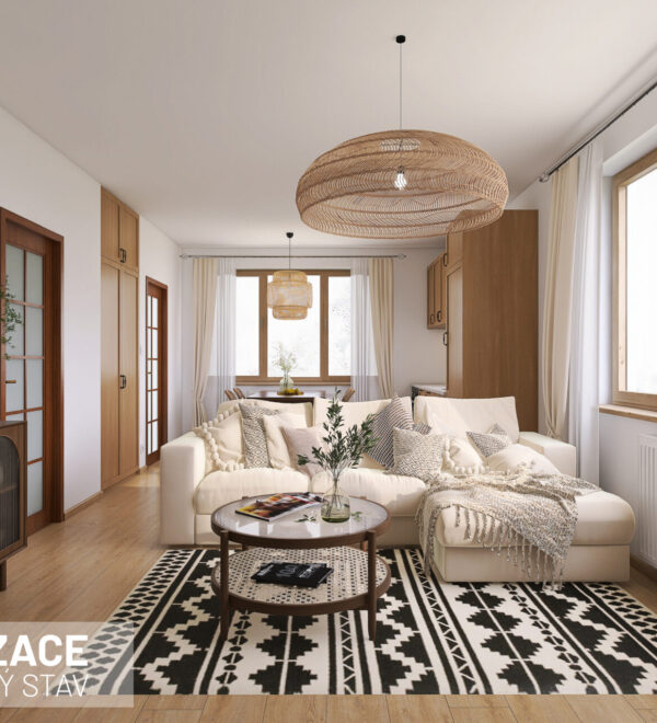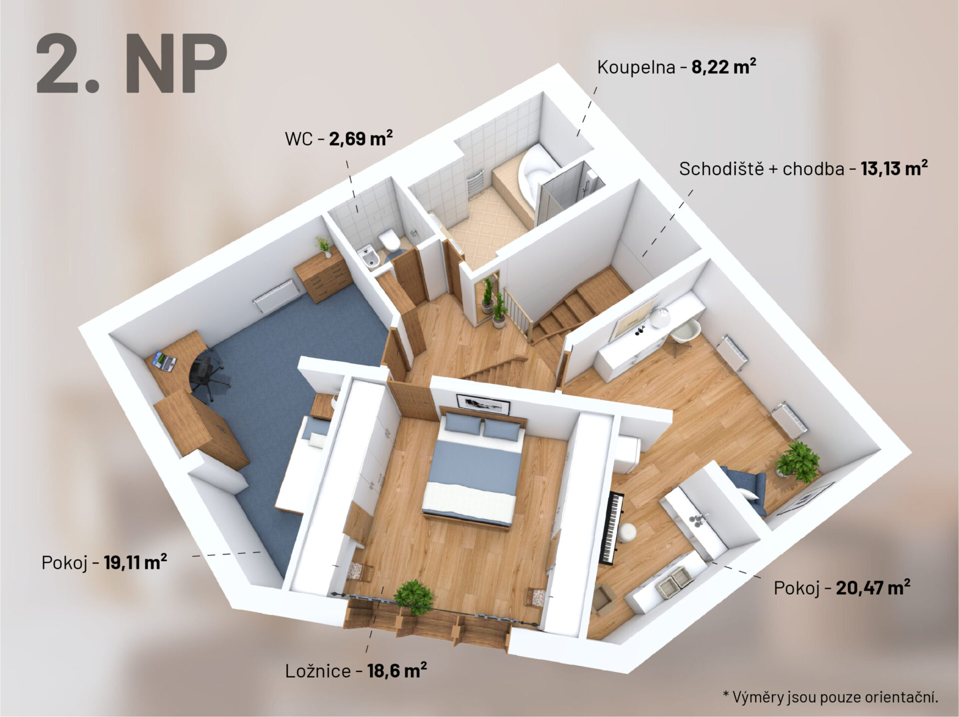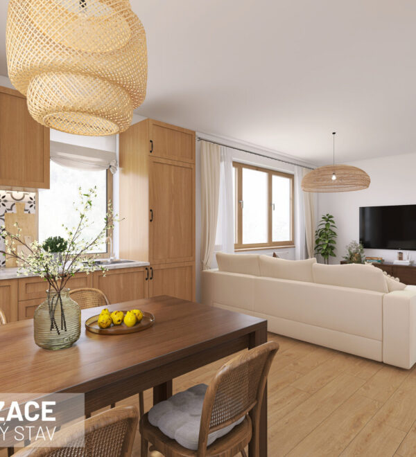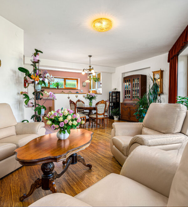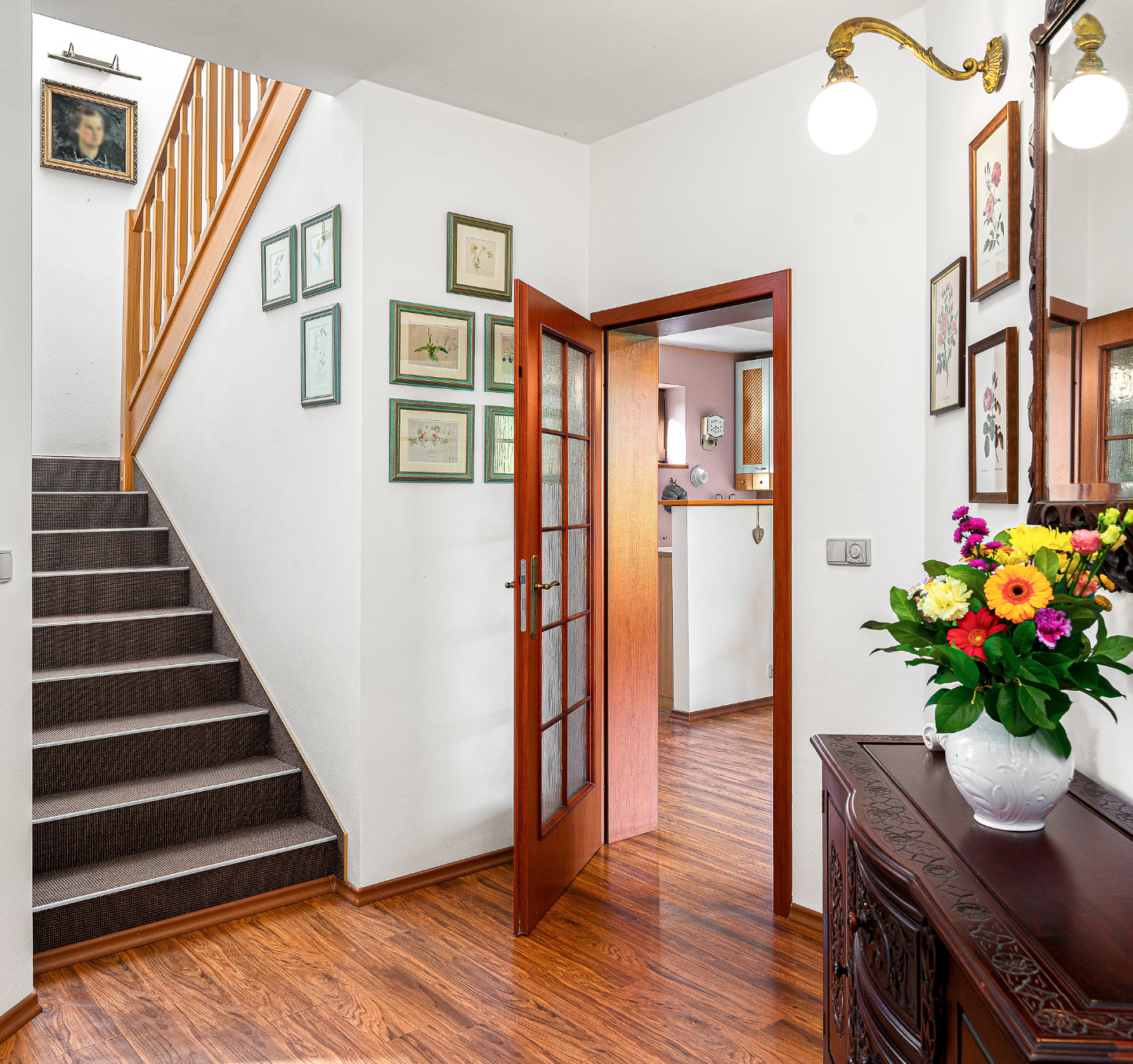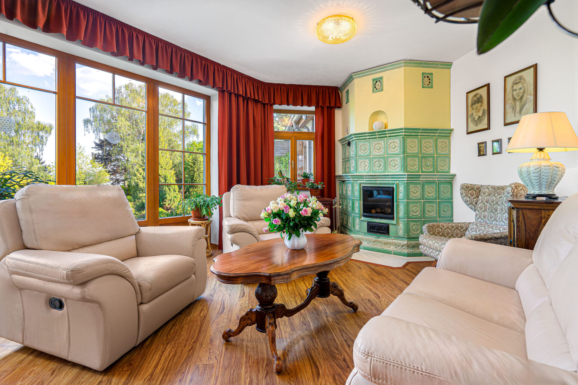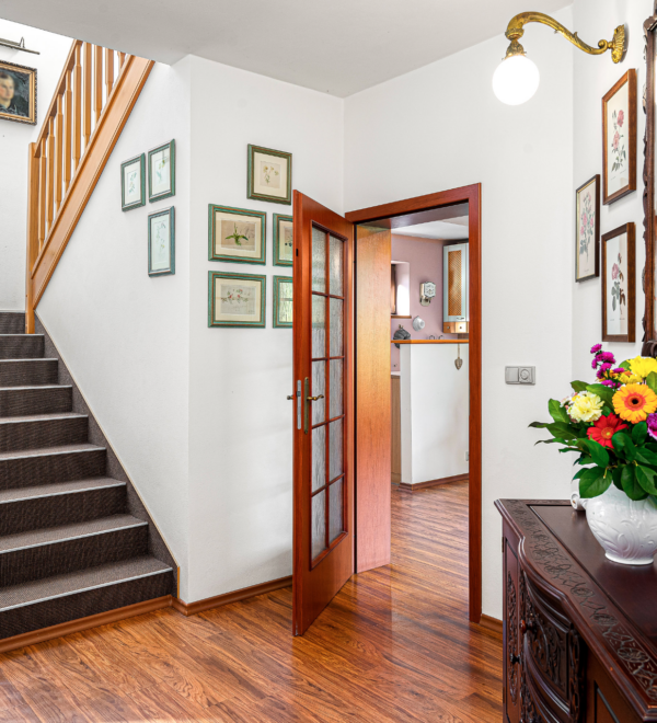 Dům o dispozici 6+kk a užitné ploše 190 m² byl postaven s ohledem na potřeby rodiny. V přízemí vás uvítá prostorný obývací pokoj s kachlovými kamny, navrženými na zakázku, propojený s kuchyňským koutem. Odtud vede vstup přímo na zahradu. Dále se zde nachází pracovna, koupelna se sprchovým koutem a vstupní hala s vestavěnými skříněmi.