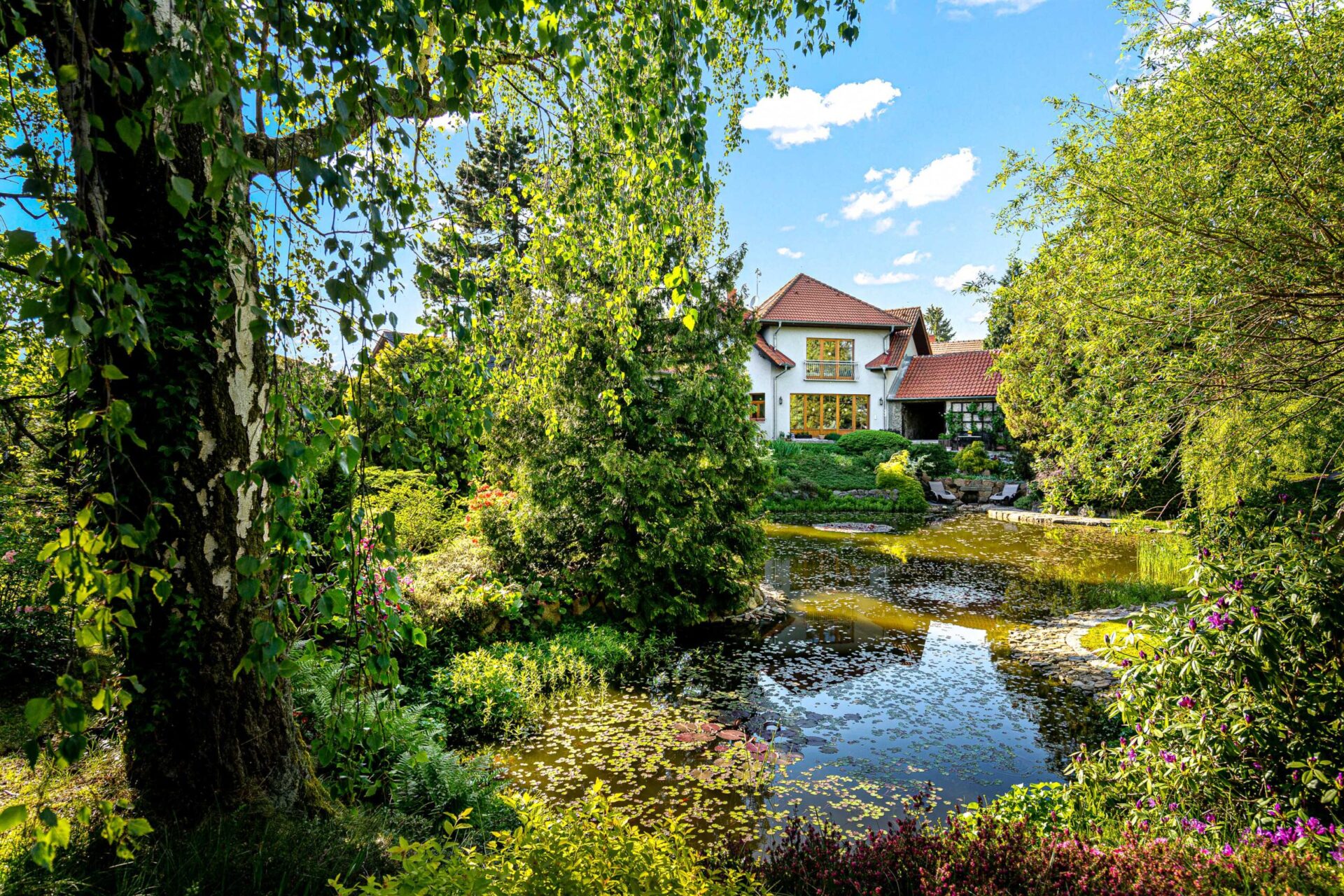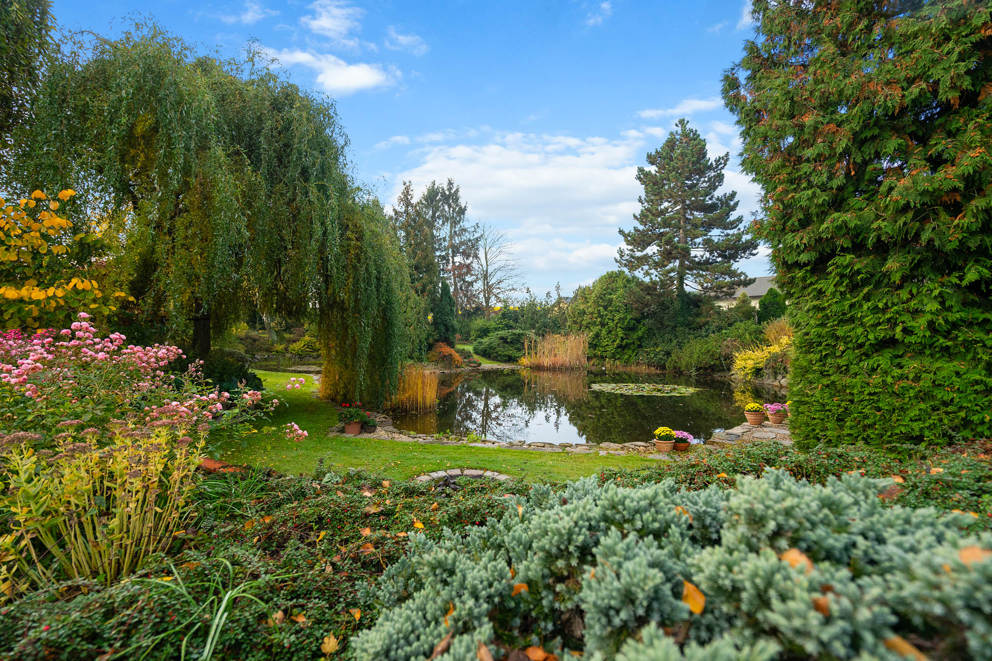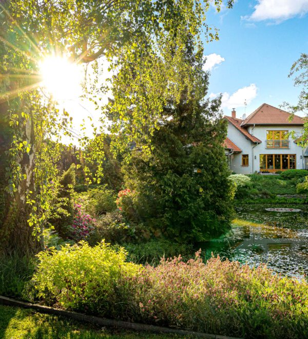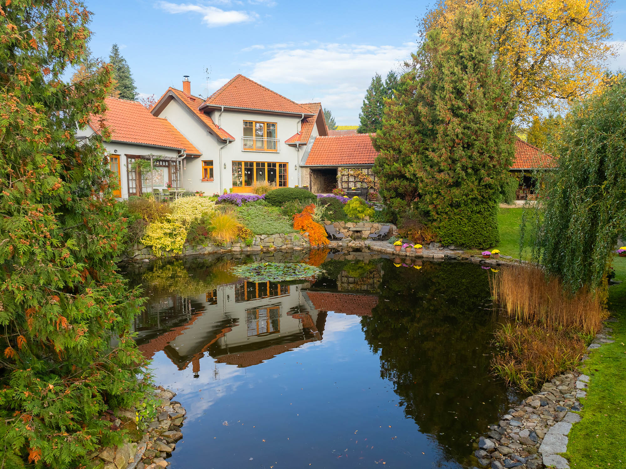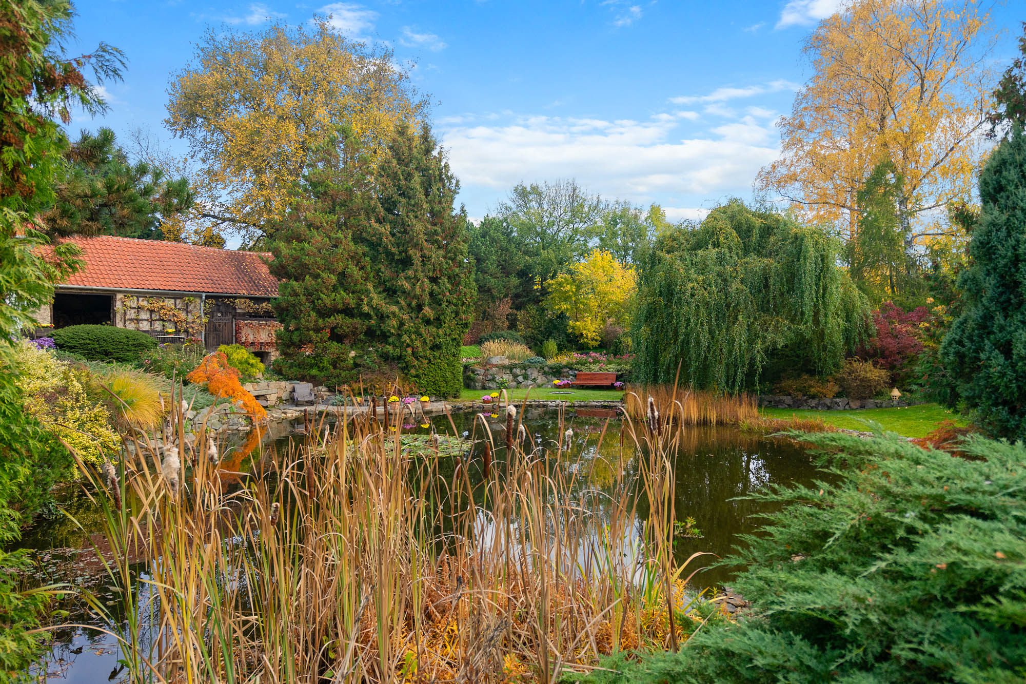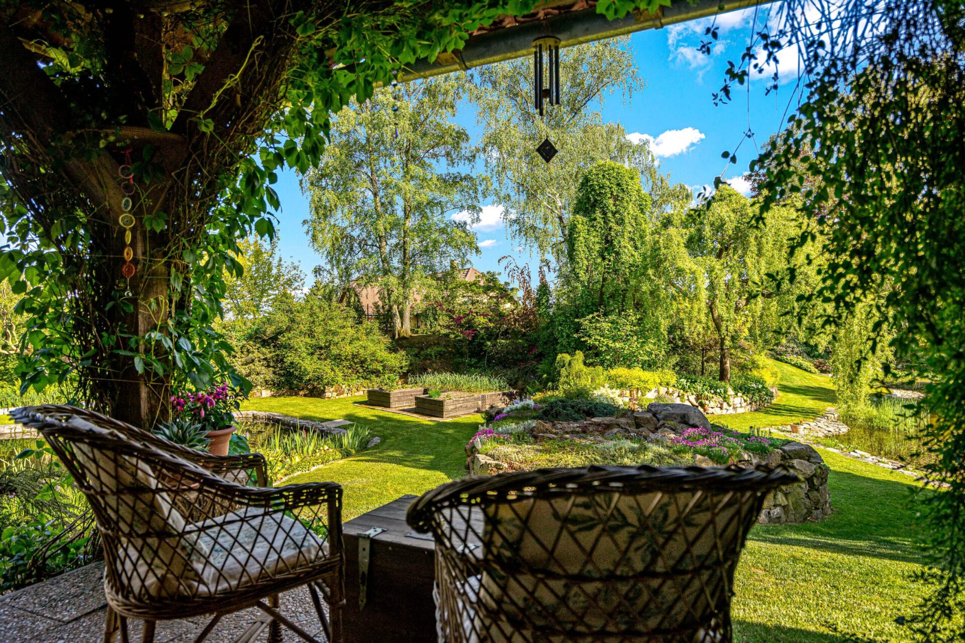Samotná dechberoucí okrasná zahrada se vzrostlými stromy a dvěma jezírky, důmyslně založená tak, aby poskytovala maximální soukromí, doslova vybízí k odpočinku nebo k objevování skrytých zákoutí. Najdete zde prostor i pro pěstování vlastní zeleniny. A jste-li milovníky přírody, jistě vás potěší i množství živočichů, kteří zde našli své útočiště. V jarních a letních měsících se můžete zaposlouchat do ptačího zpěvu či milostného kuňkání žab. Budete-li mít štěstí, spatříte zde i ledňáčka či volavku.
