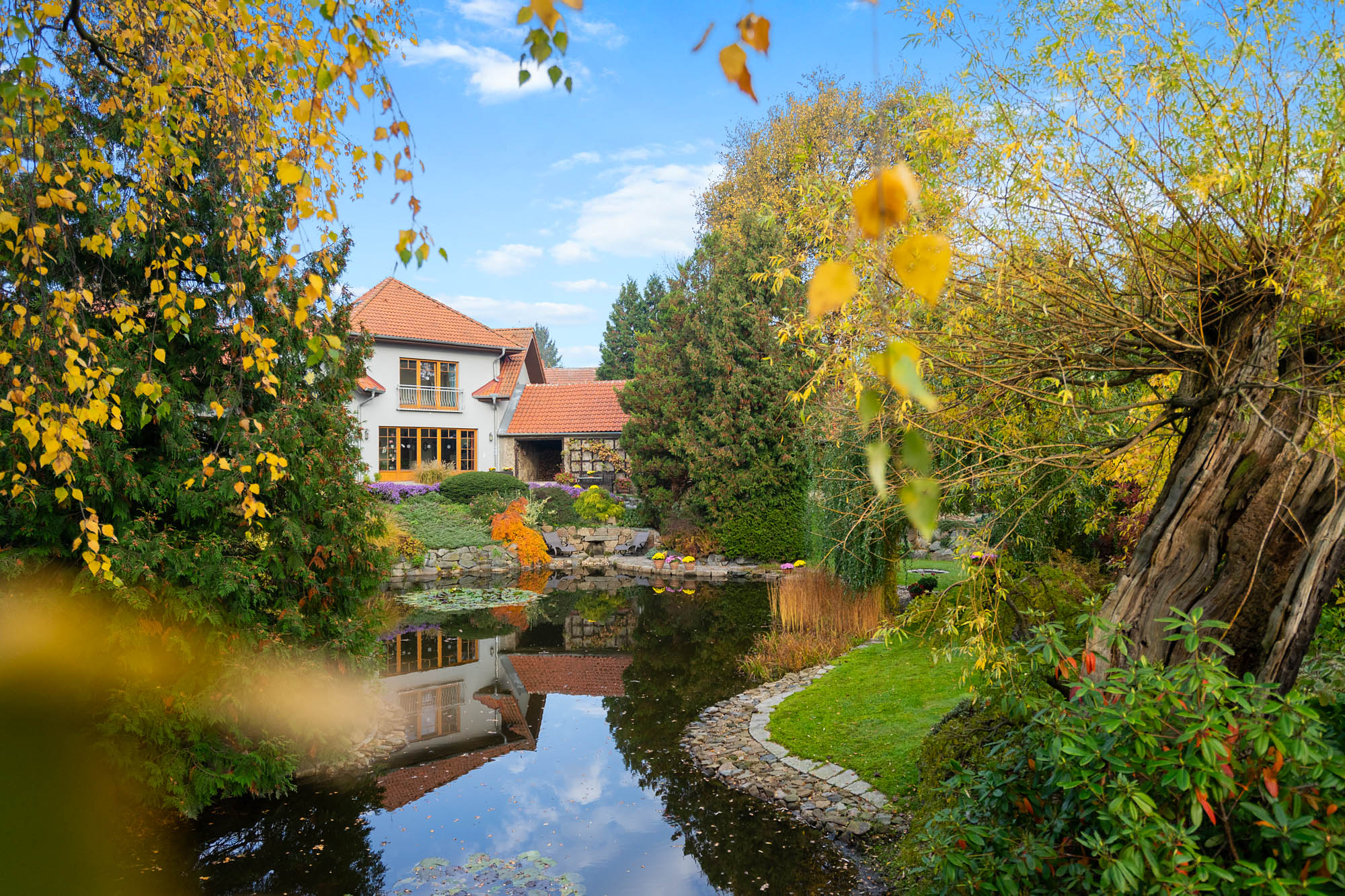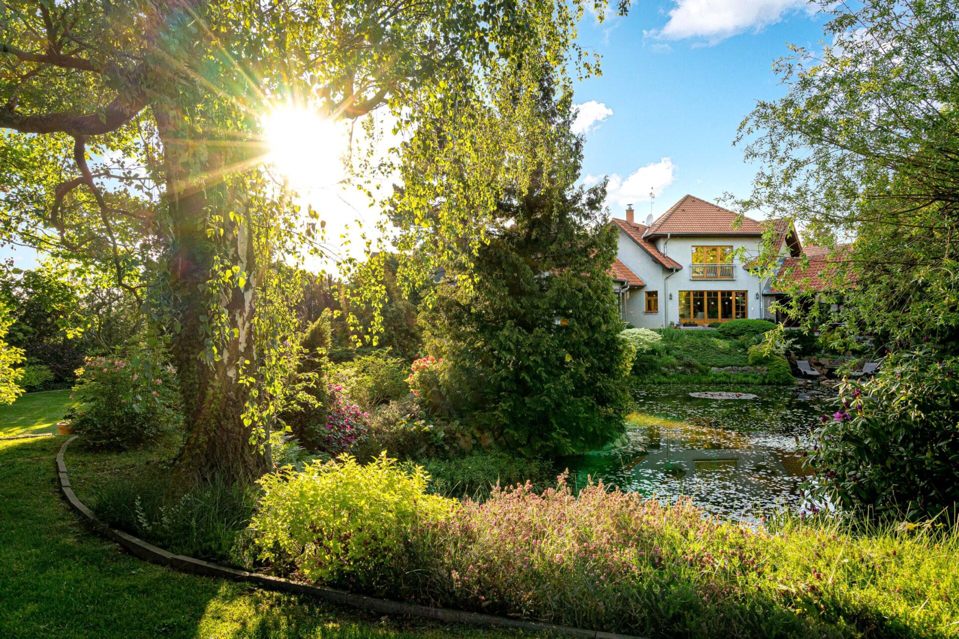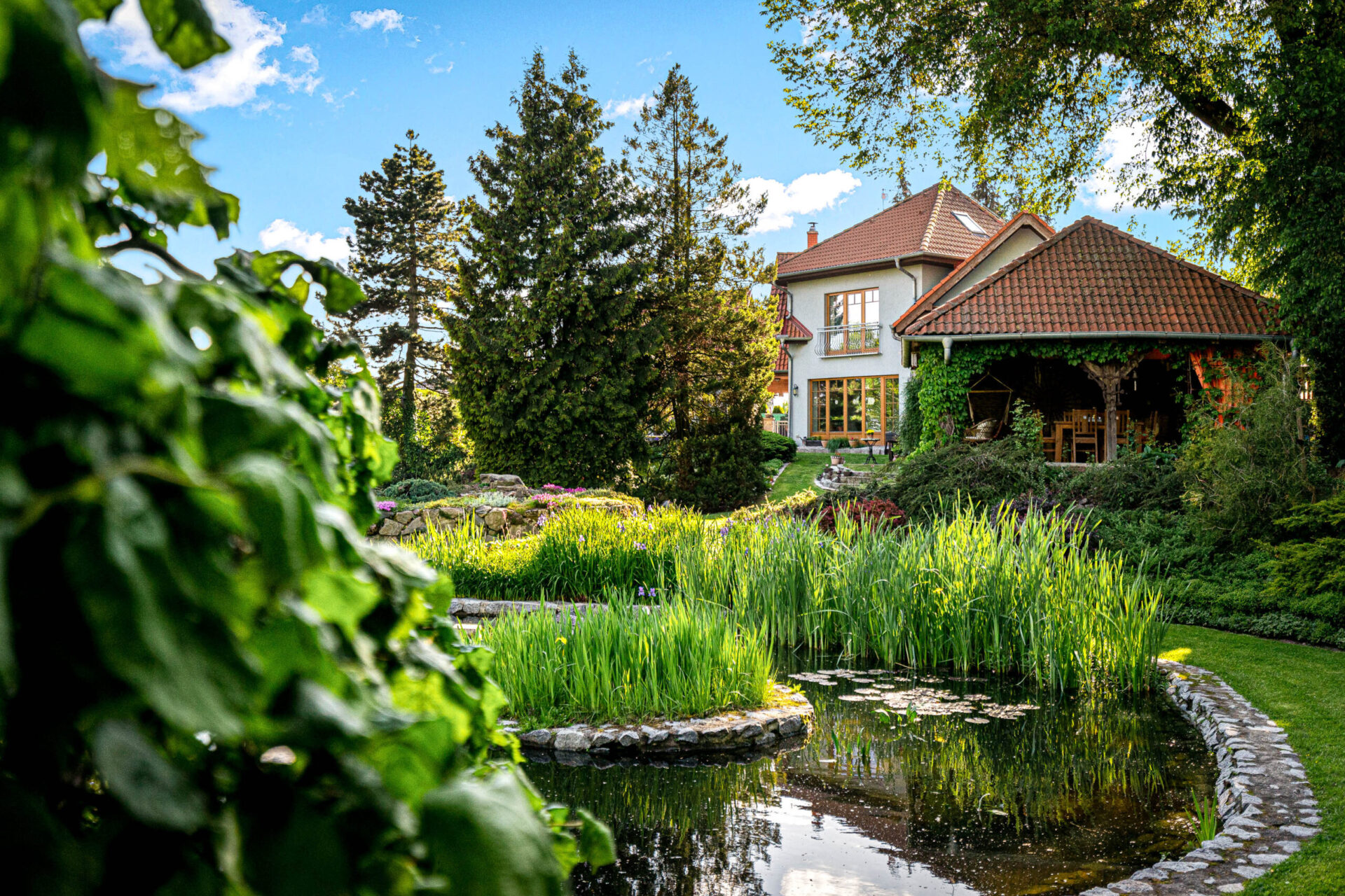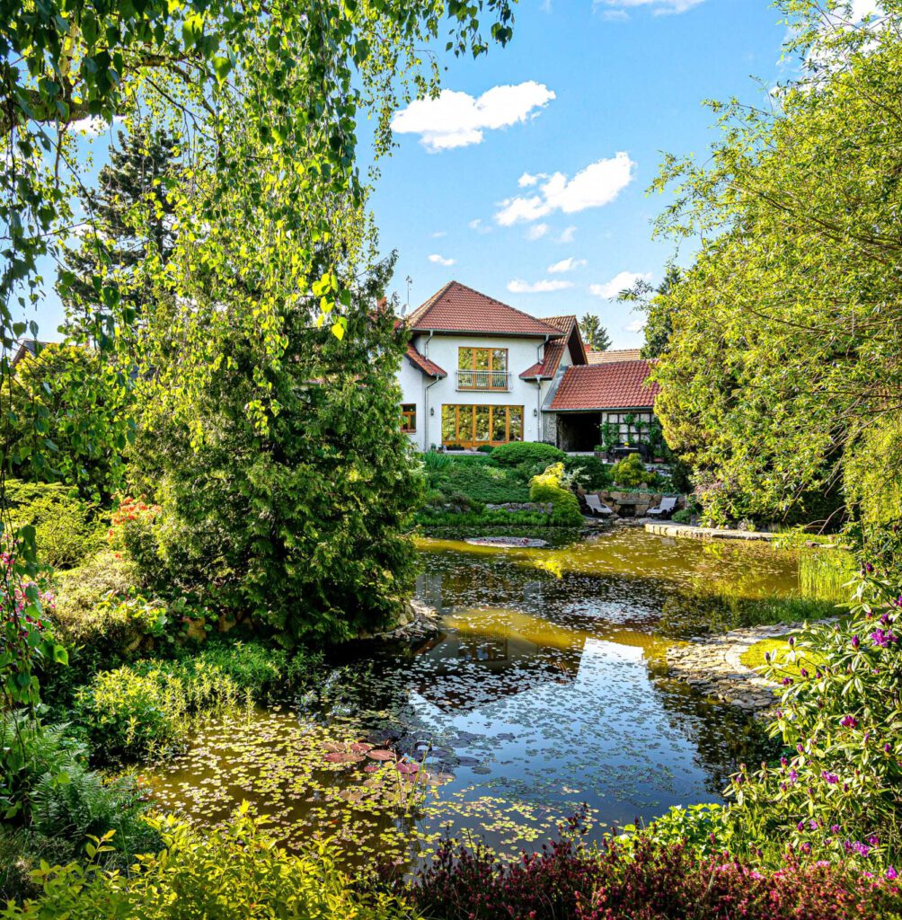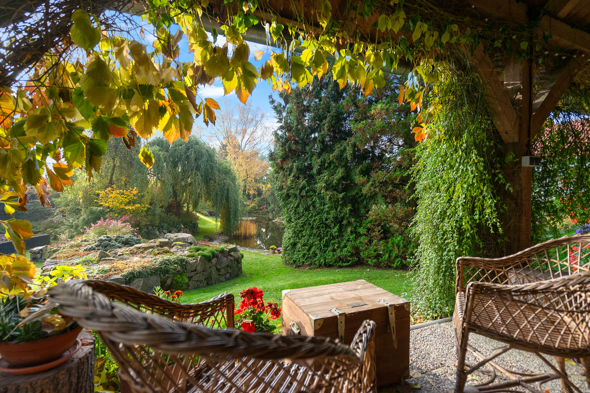 Samotná dechberoucí okrasná zahrada se vzrostlými stromy a dvěma jezírky, důmyslně založená tak, aby poskytovala maximální soukromí, doslova vybízí k odpočinku nebo k objevování skrytých zákoutí. Najdete zde prostor i pro pěstování vlastní zeleniny. A jste-li milovníky přírody, jistě vás potěší i množství živočichů, kteří zde našli své útočiště. V jarních a letních měsících se můžete zaposlouchat do ptačího zpěvu či milostného kuňkání žab. Budete-li mít štěstí, spatříte zde i ledňáčka či volavku.