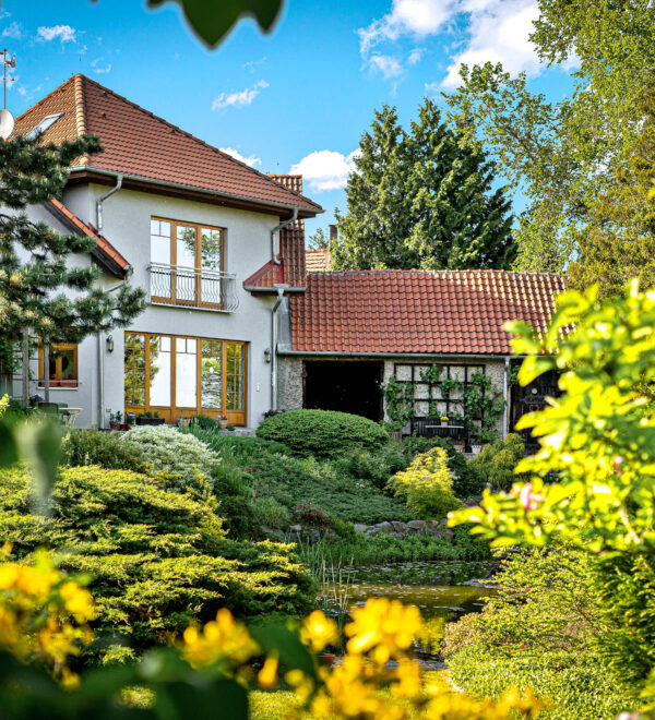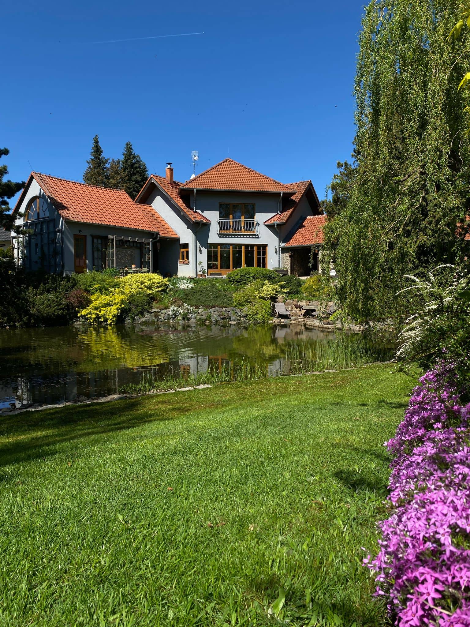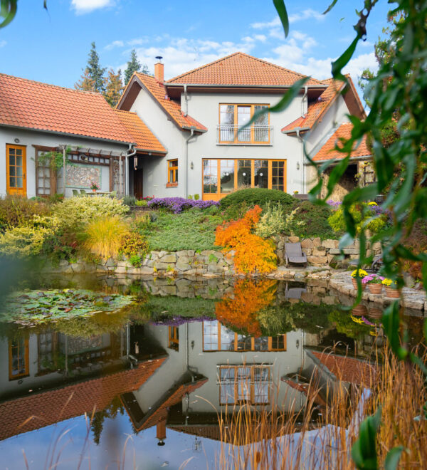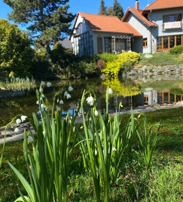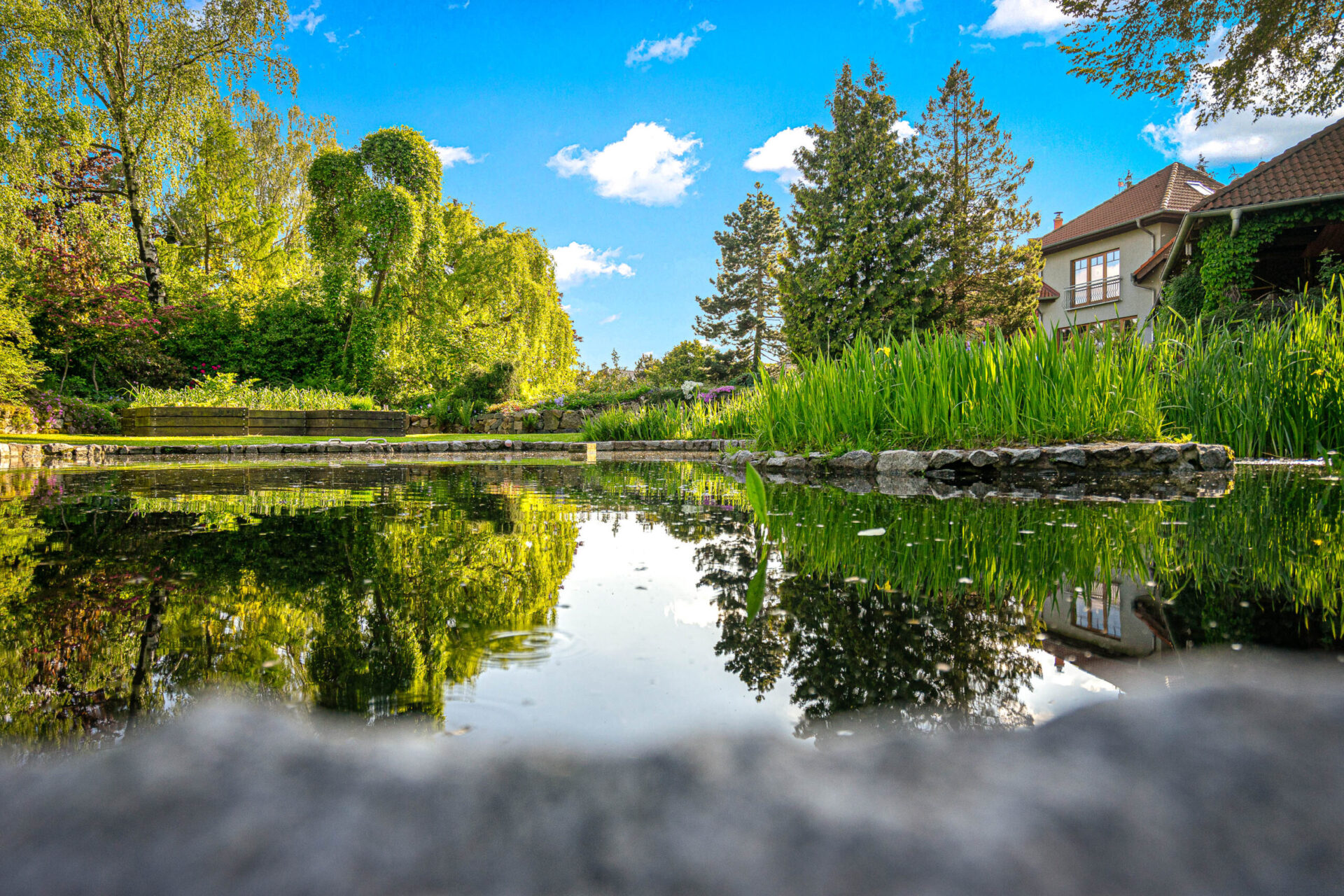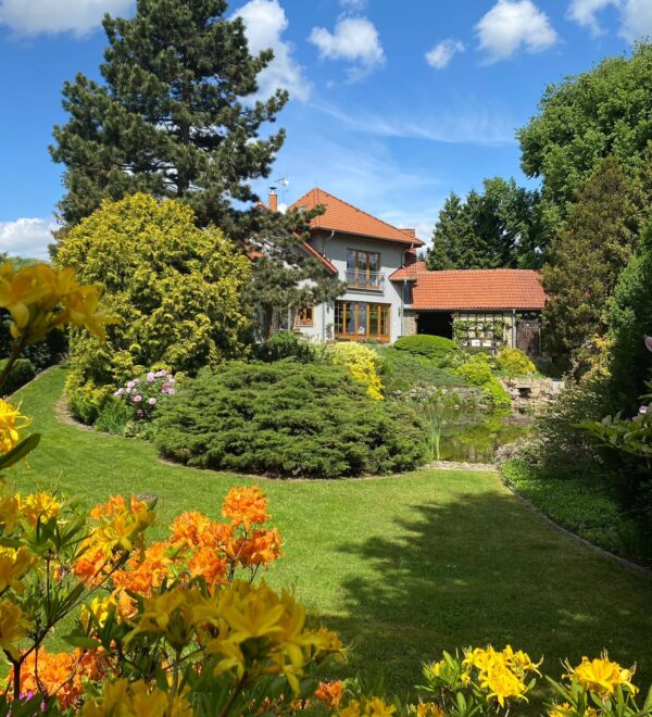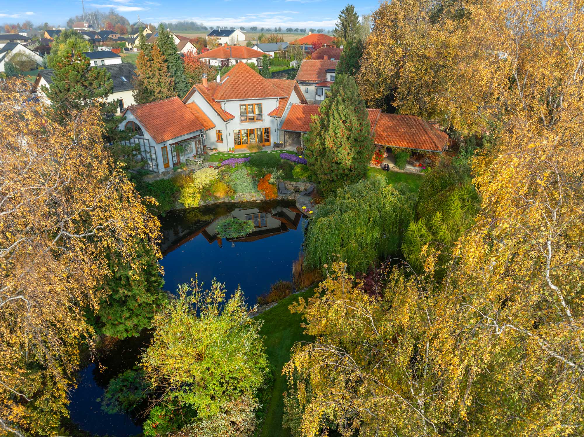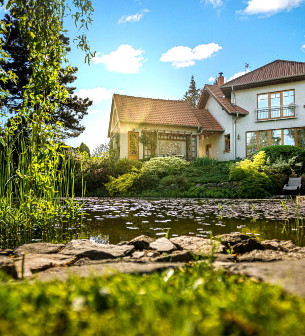 Samotná dechberoucí okrasná zahrada se vzrostlými stromy a dvěma jezírky, důmyslně založená tak, aby poskytovala maximální soukromí, doslova vybízí k odpočinku nebo k objevování skrytých zákoutí. Najdete zde prostor i pro pěstování vlastní zeleniny. A jste-li milovníky přírody, jistě vás potěší i množství živočichů, kteří zde našli své útočiště. V jarních a letních měsících se můžete zaposlouchat do ptačího zpěvu či milostného kuňkání žab. Budete-li mít štěstí, spatříte zde i ledňáčka či volavku.