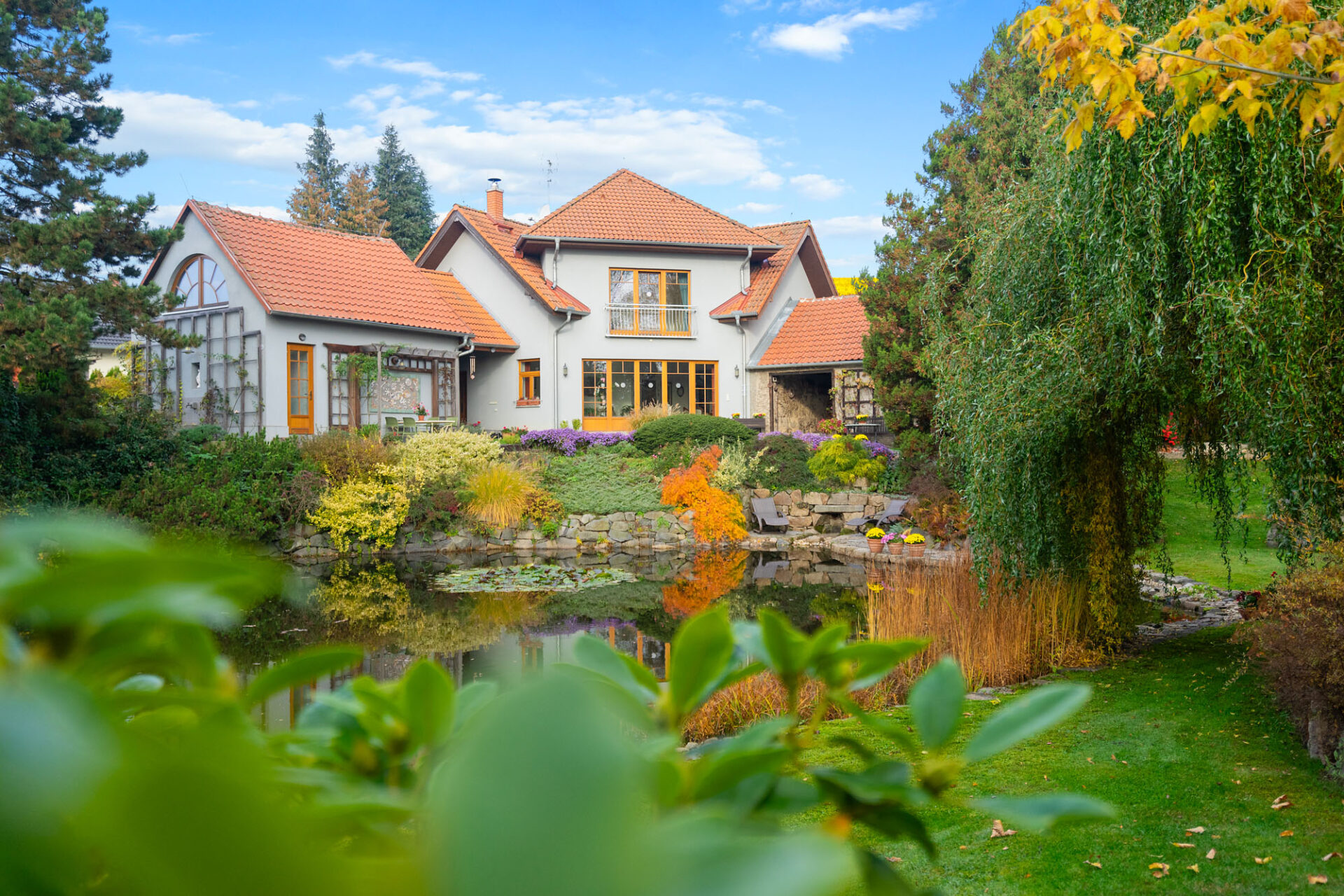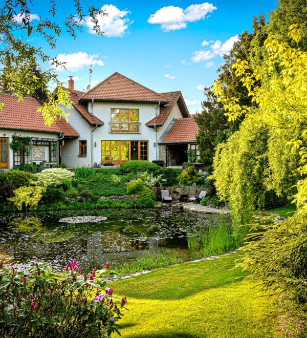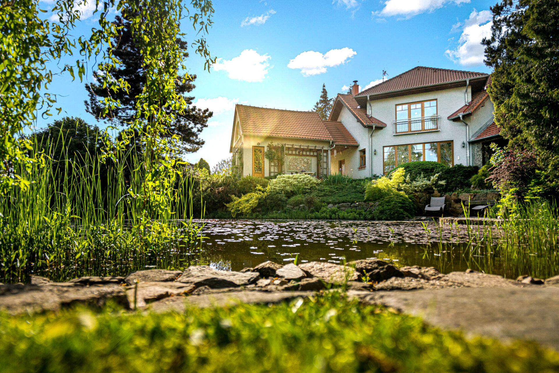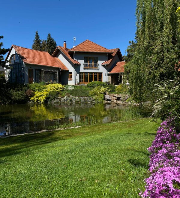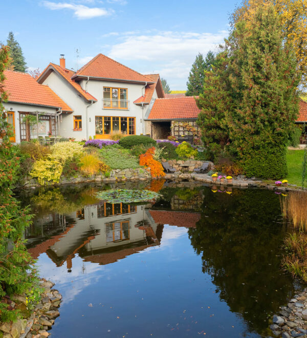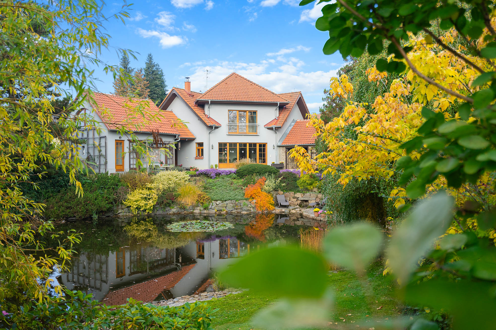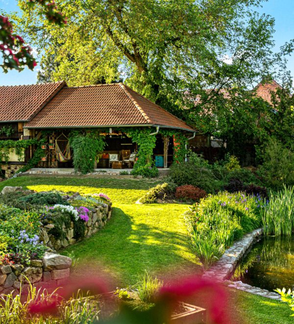 Samotná dechberoucí okrasná zahrada se vzrostlými stromy a dvěma jezírky, důmyslně založená tak, aby poskytovala maximální soukromí, doslova vybízí k odpočinku nebo k objevování skrytých zákoutí. Najdete zde prostor i pro pěstování vlastní zeleniny. A jste-li milovníky přírody, jistě vás potěší i množství živočichů, kteří zde našli své útočiště. V jarních a letních měsících se můžete zaposlouchat do ptačího zpěvu či milostného kuňkání žab. Budete-li mít štěstí, spatříte zde i ledňáčka či volavku.