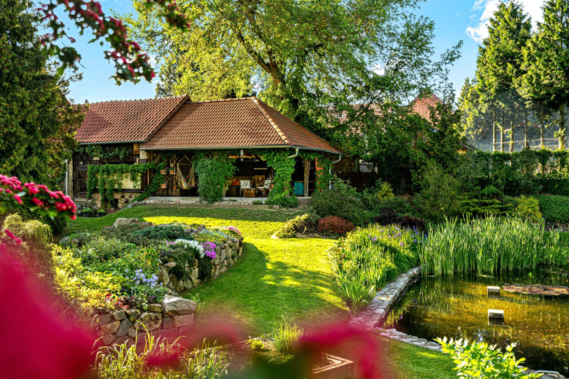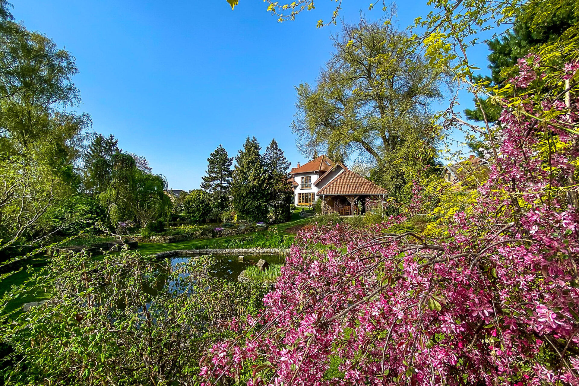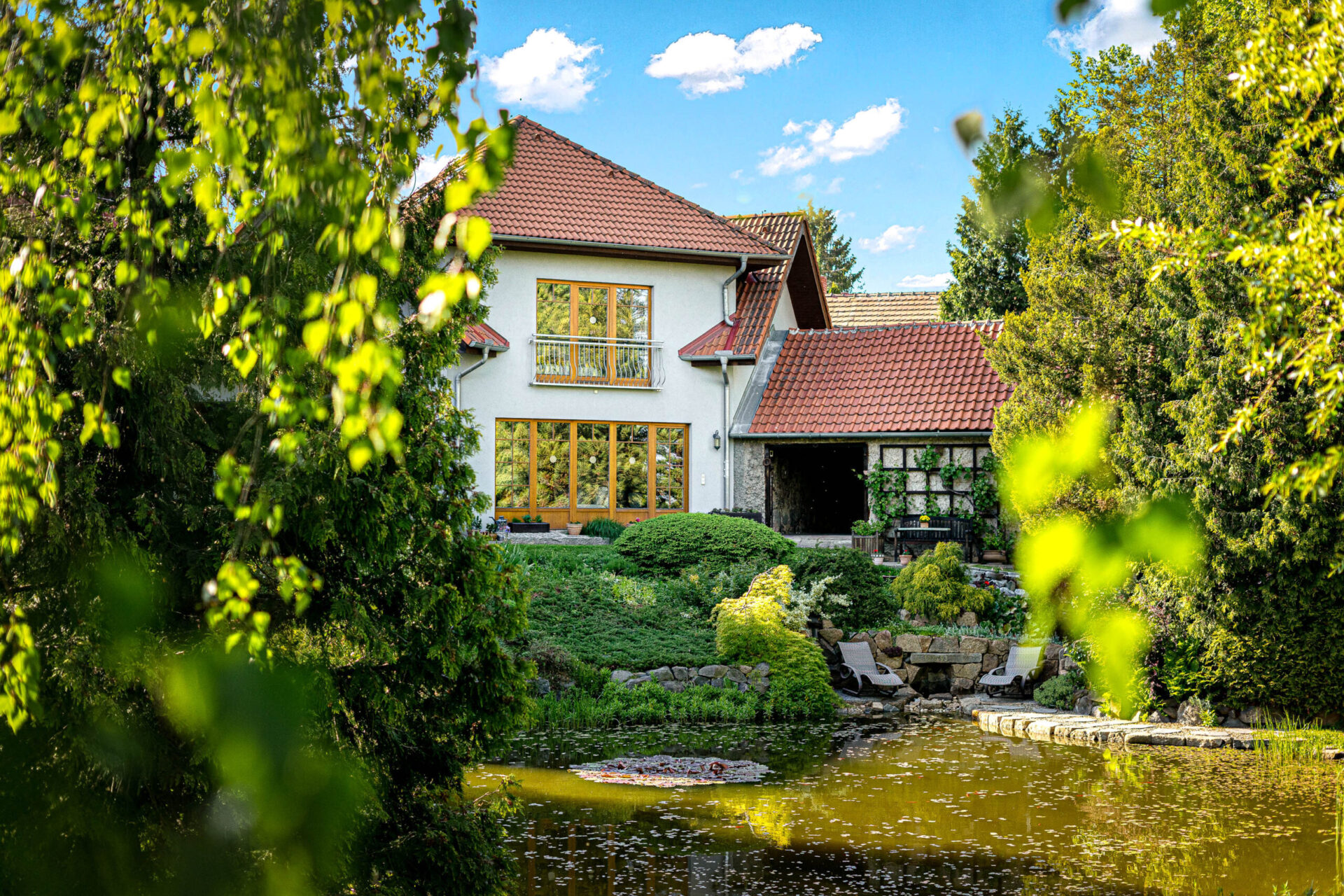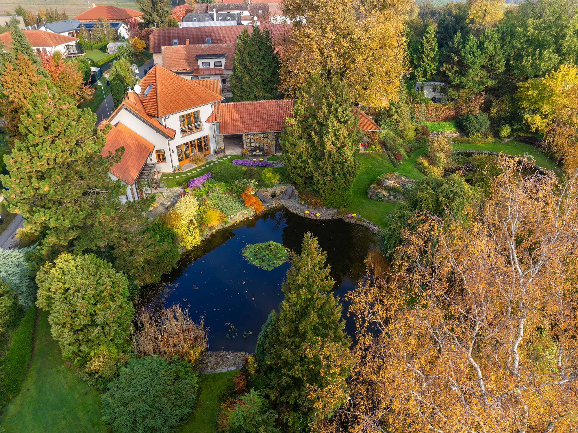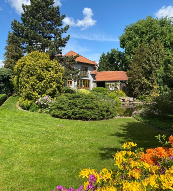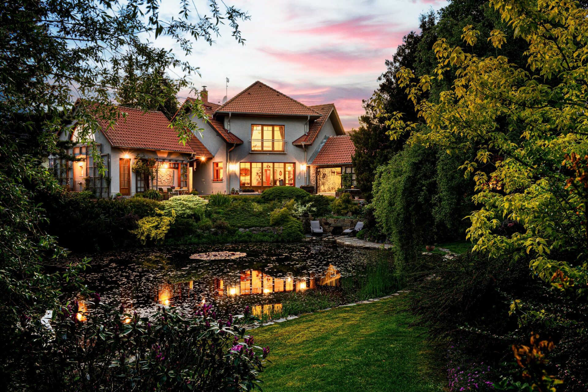 Samotná dechberoucí okrasná zahrada se vzrostlými stromy a dvěma jezírky, důmyslně založená tak, aby poskytovala maximální soukromí, doslova vybízí k odpočinku nebo k objevování skrytých zákoutí. Najdete zde prostor i pro pěstování vlastní zeleniny. A jste-li milovníky přírody, jistě vás potěší i množství živočichů, kteří zde našli své útočiště. V jarních a letních měsících se můžete zaposlouchat do ptačího zpěvu či milostného kuňkání žab. Budete-li mít štěstí, spatříte zde i ledňáčka či volavku.