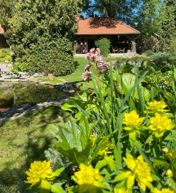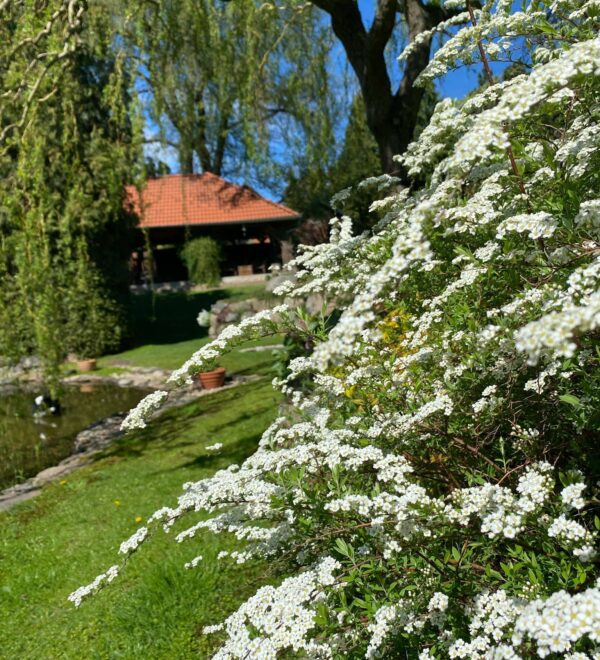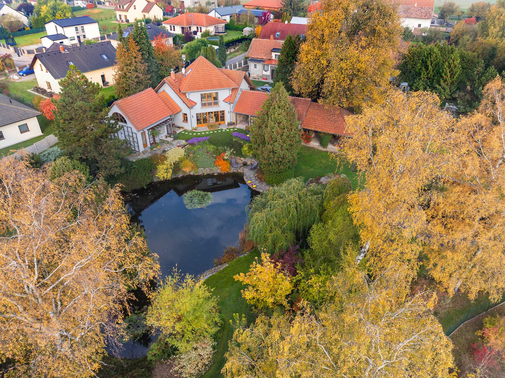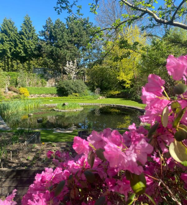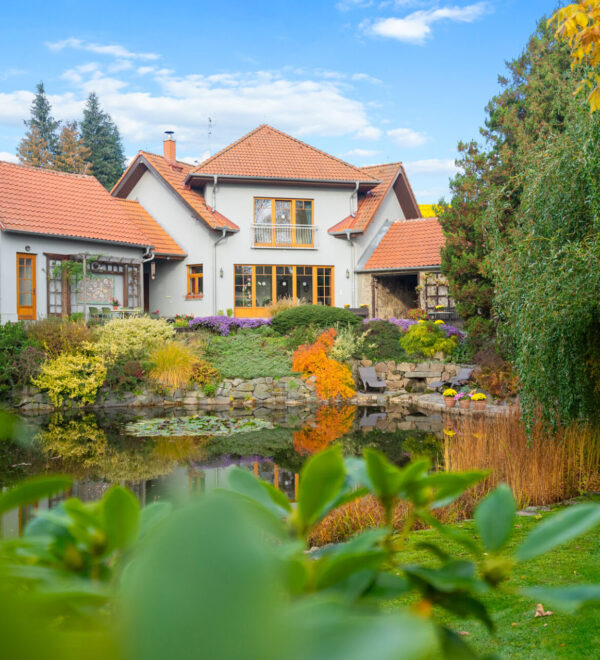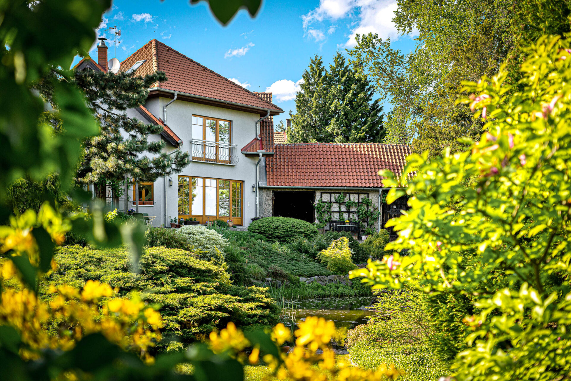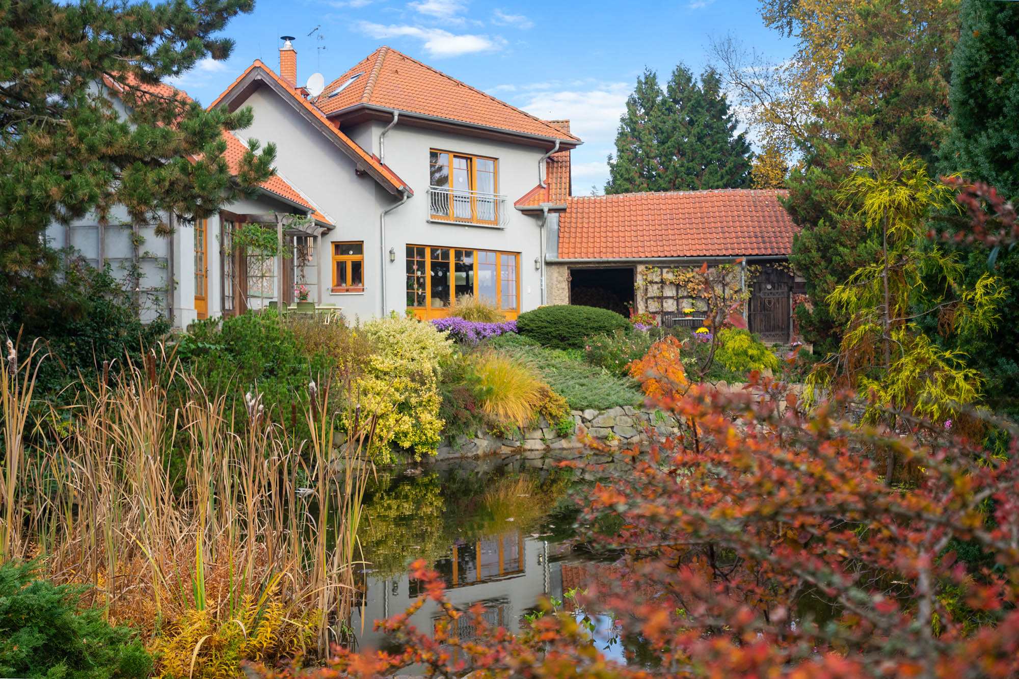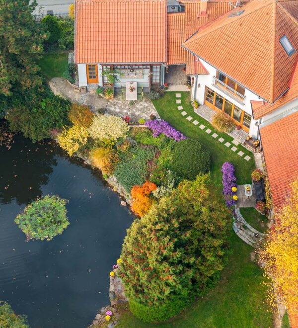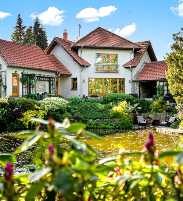 Samotná dechberoucí okrasná zahrada se vzrostlými stromy a dvěma jezírky, důmyslně založená tak, aby poskytovala maximální soukromí, doslova vybízí k odpočinku nebo k objevování skrytých zákoutí. Najdete zde prostor i pro pěstování vlastní zeleniny. A jste-li milovníky přírody, jistě vás potěší i množství živočichů, kteří zde našli své útočiště. V jarních a letních měsících se můžete zaposlouchat do ptačího zpěvu či milostného kuňkání žab. Budete-li mít štěstí, spatříte zde i ledňáčka či volavku.