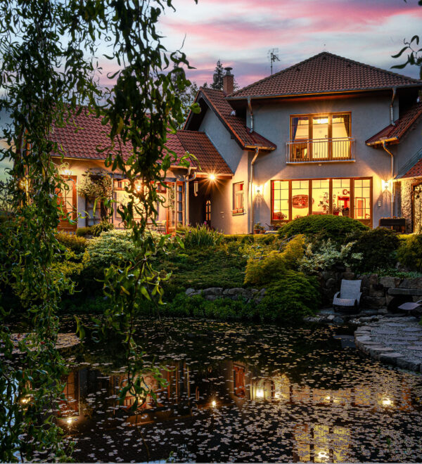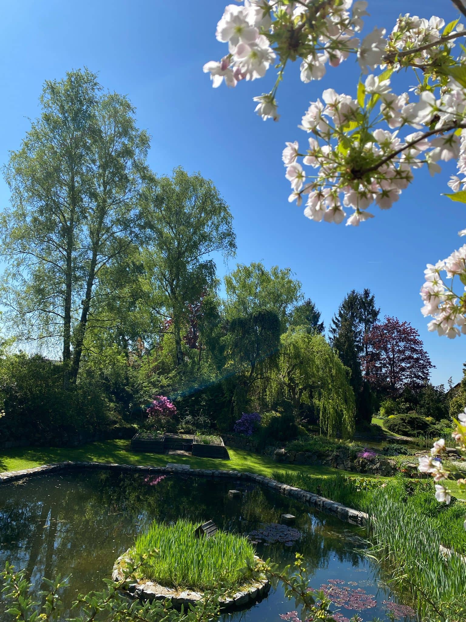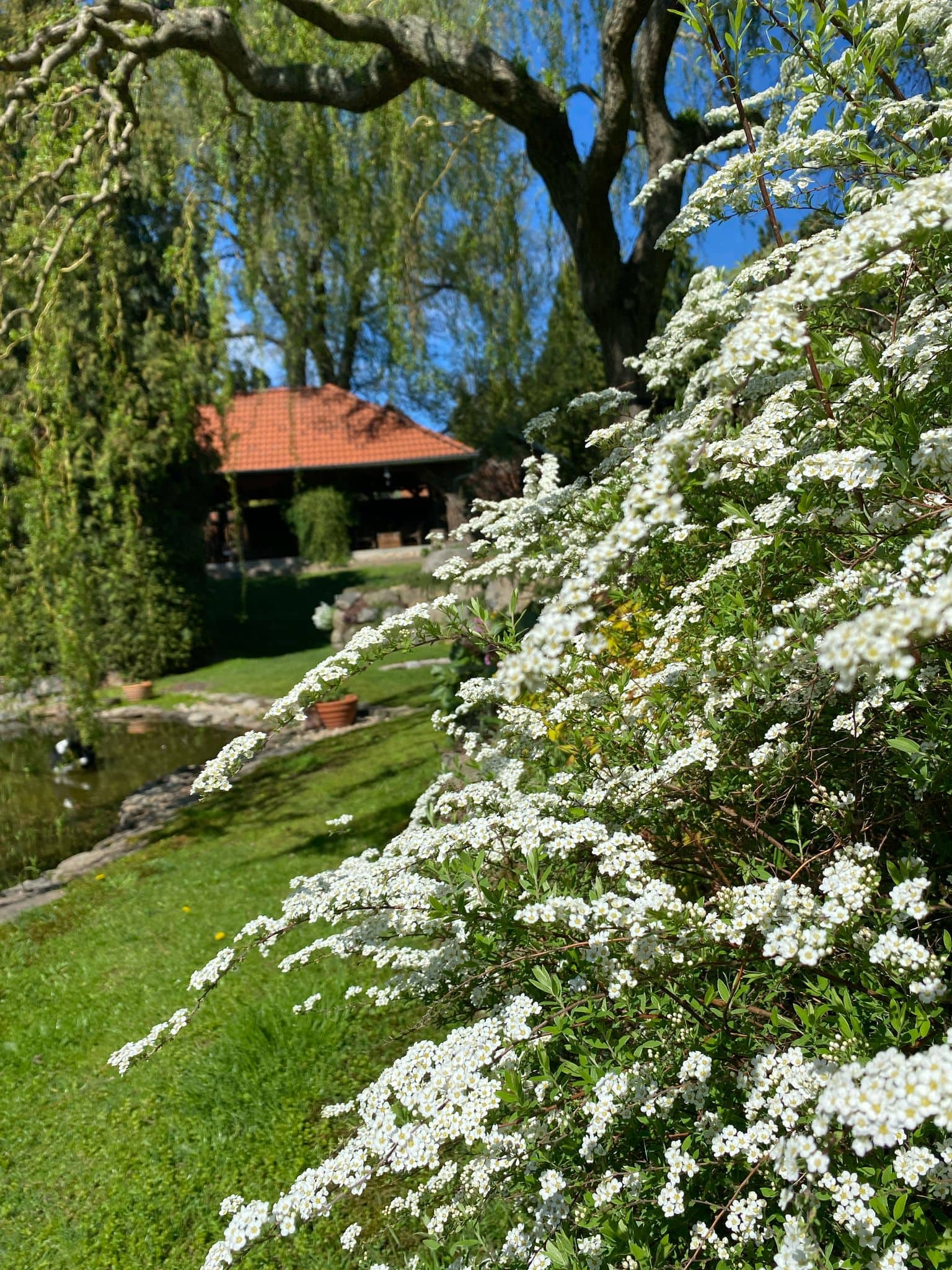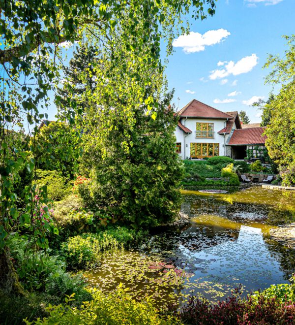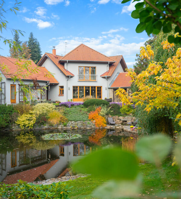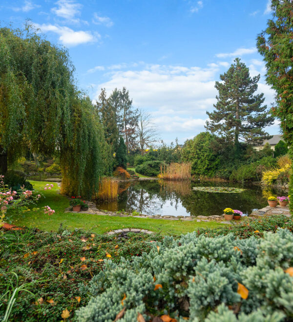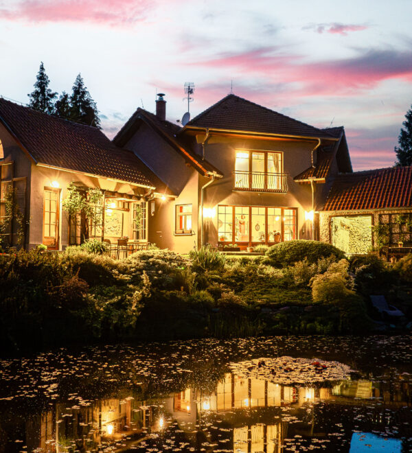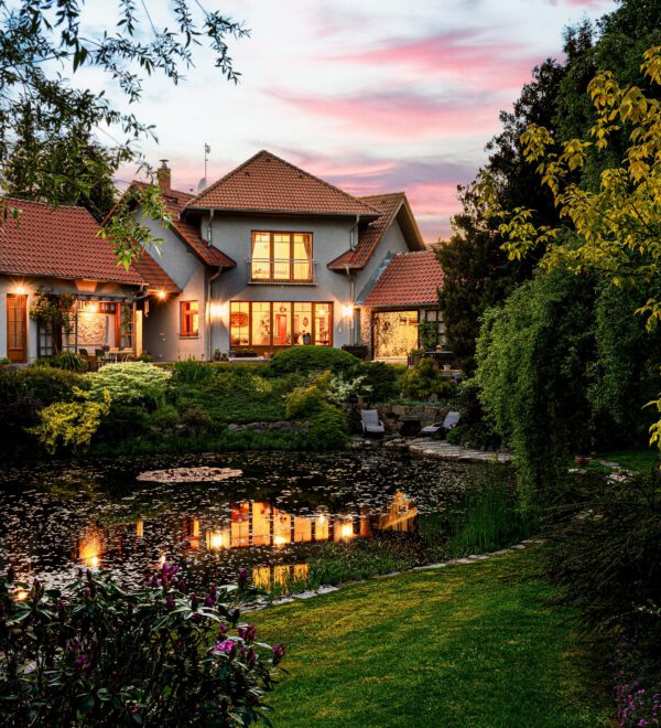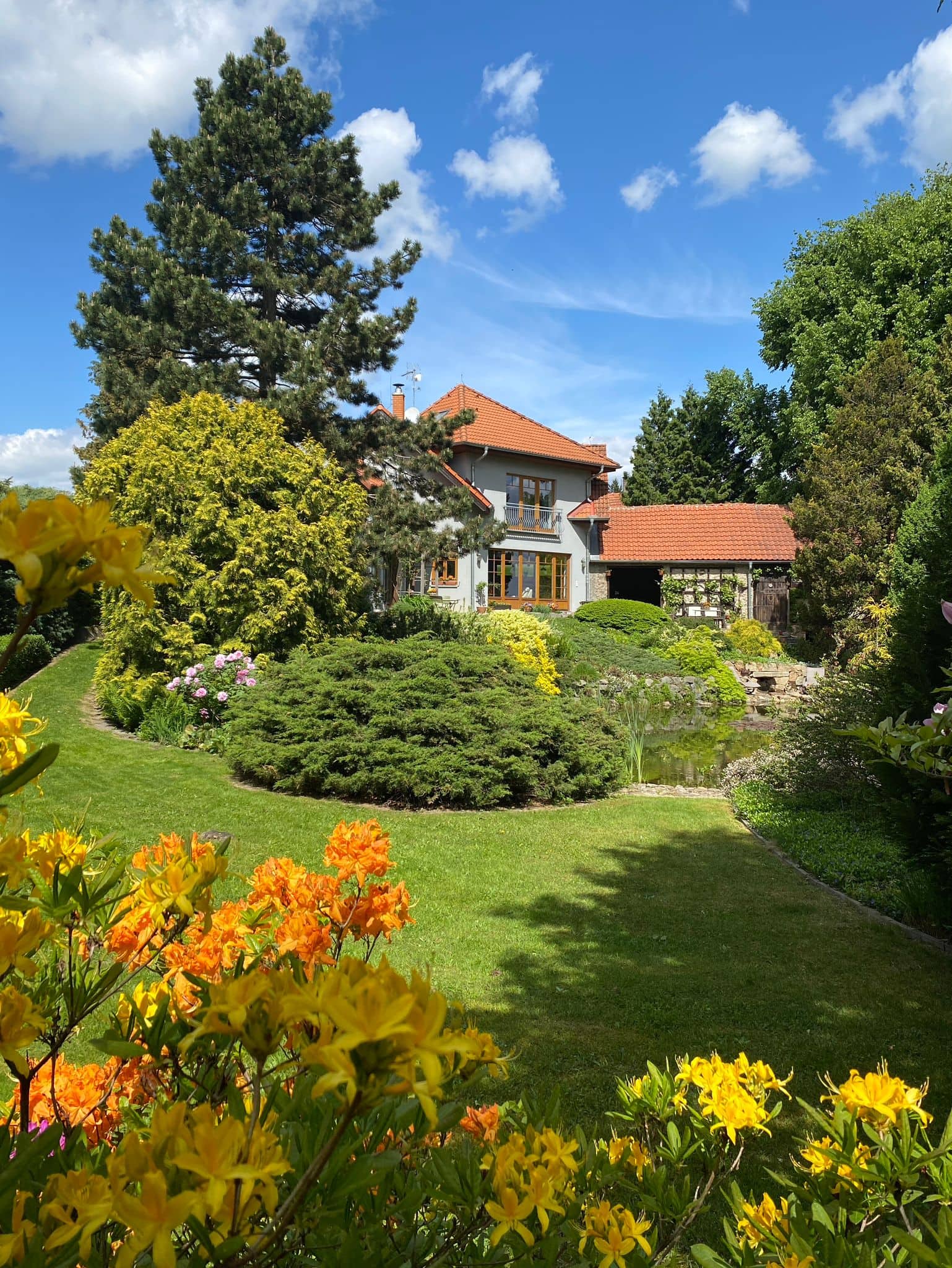 Samotná dechberoucí okrasná zahrada se vzrostlými stromy a dvěma jezírky, důmyslně založená tak, aby poskytovala maximální soukromí, doslova vybízí k odpočinku nebo k objevování skrytých zákoutí. Najdete zde prostor i pro pěstování vlastní zeleniny. A jste-li milovníky přírody, jistě vás potěší i množství živočichů, kteří zde našli své útočiště. V jarních a letních měsících se můžete zaposlouchat do ptačího zpěvu či milostného kuňkání žab. Budete-li mít štěstí, spatříte zde i ledňáčka či volavku.