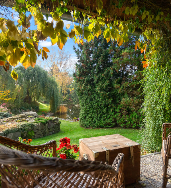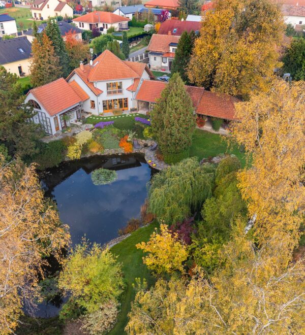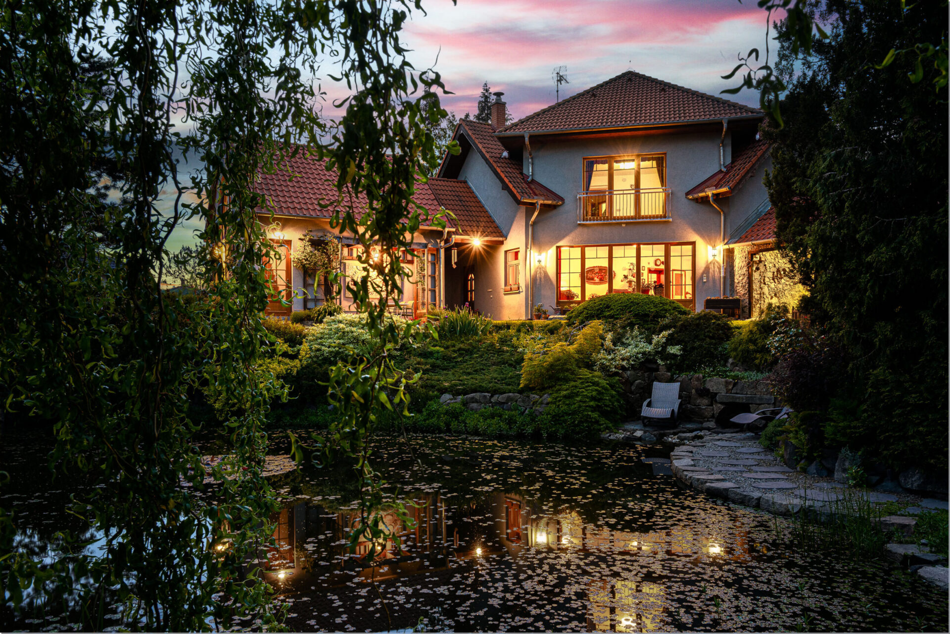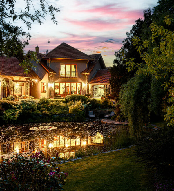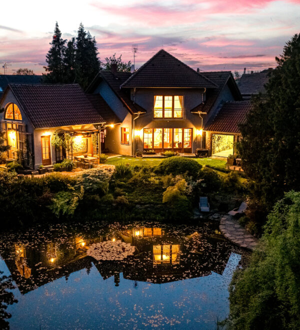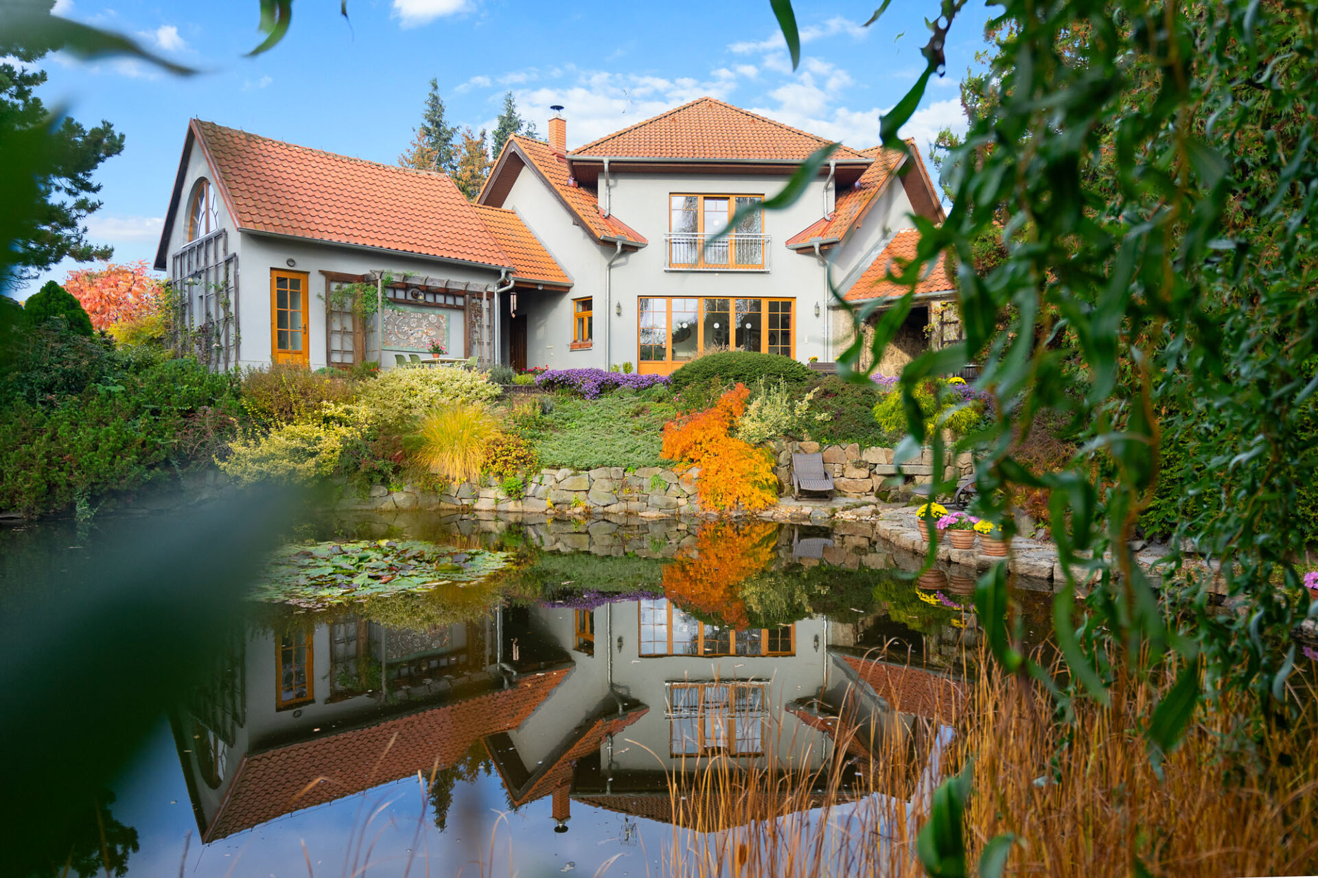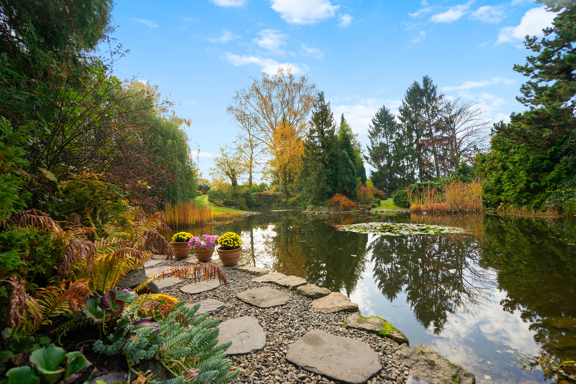 Samotná dechberoucí okrasná zahrada se vzrostlými stromy a dvěma jezírky, důmyslně založená tak, aby poskytovala maximální soukromí, doslova vybízí k odpočinku nebo k objevování skrytých zákoutí. Najdete zde prostor i pro pěstování vlastní zeleniny. A jste-li milovníky přírody, jistě vás potěší i množství živočichů, kteří zde našli své útočiště. V jarních a letních měsících se můžete zaposlouchat do ptačího zpěvu či milostného kuňkání žab. Budete-li mít štěstí, spatříte zde i ledňáčka či volavku.