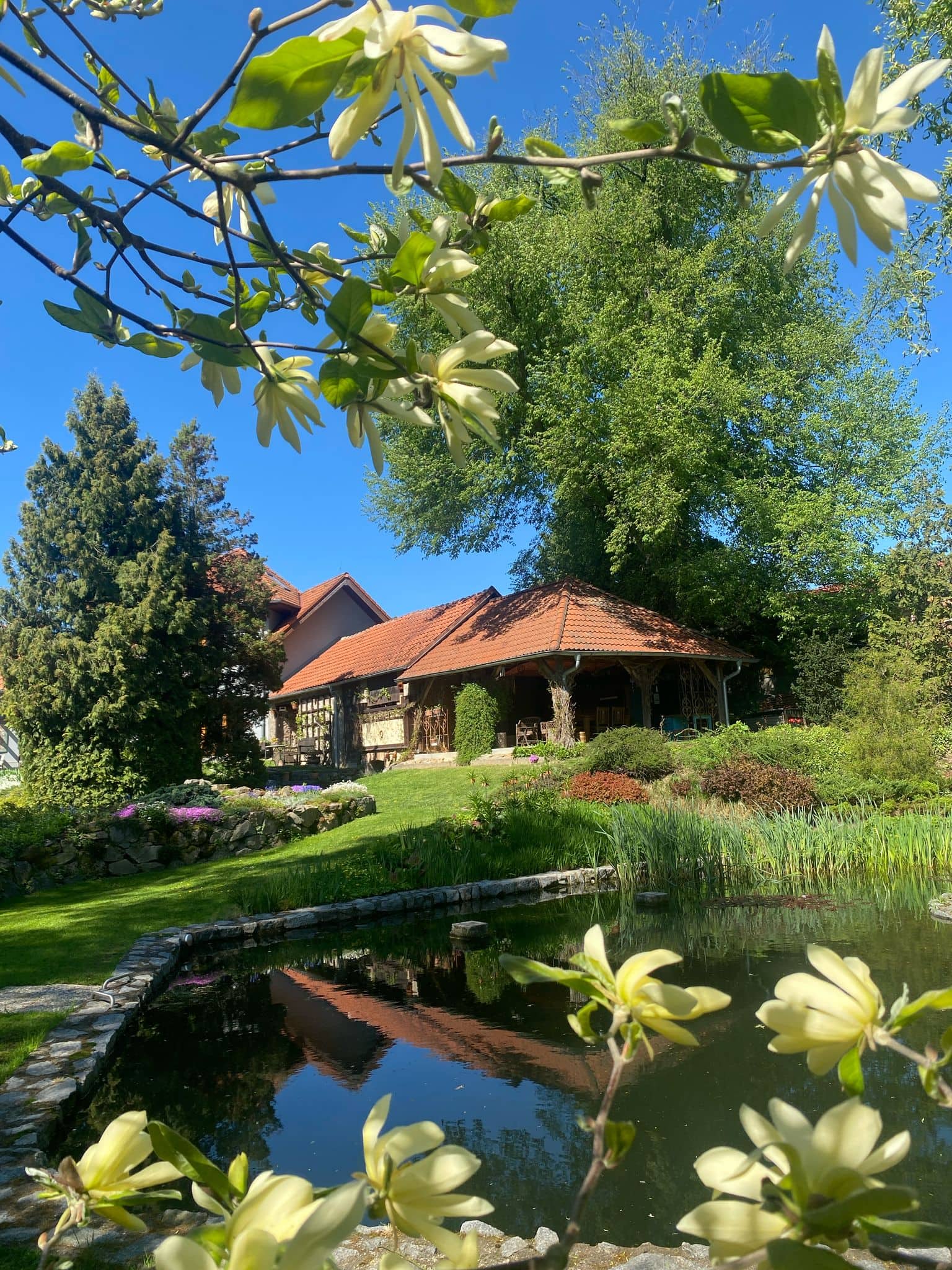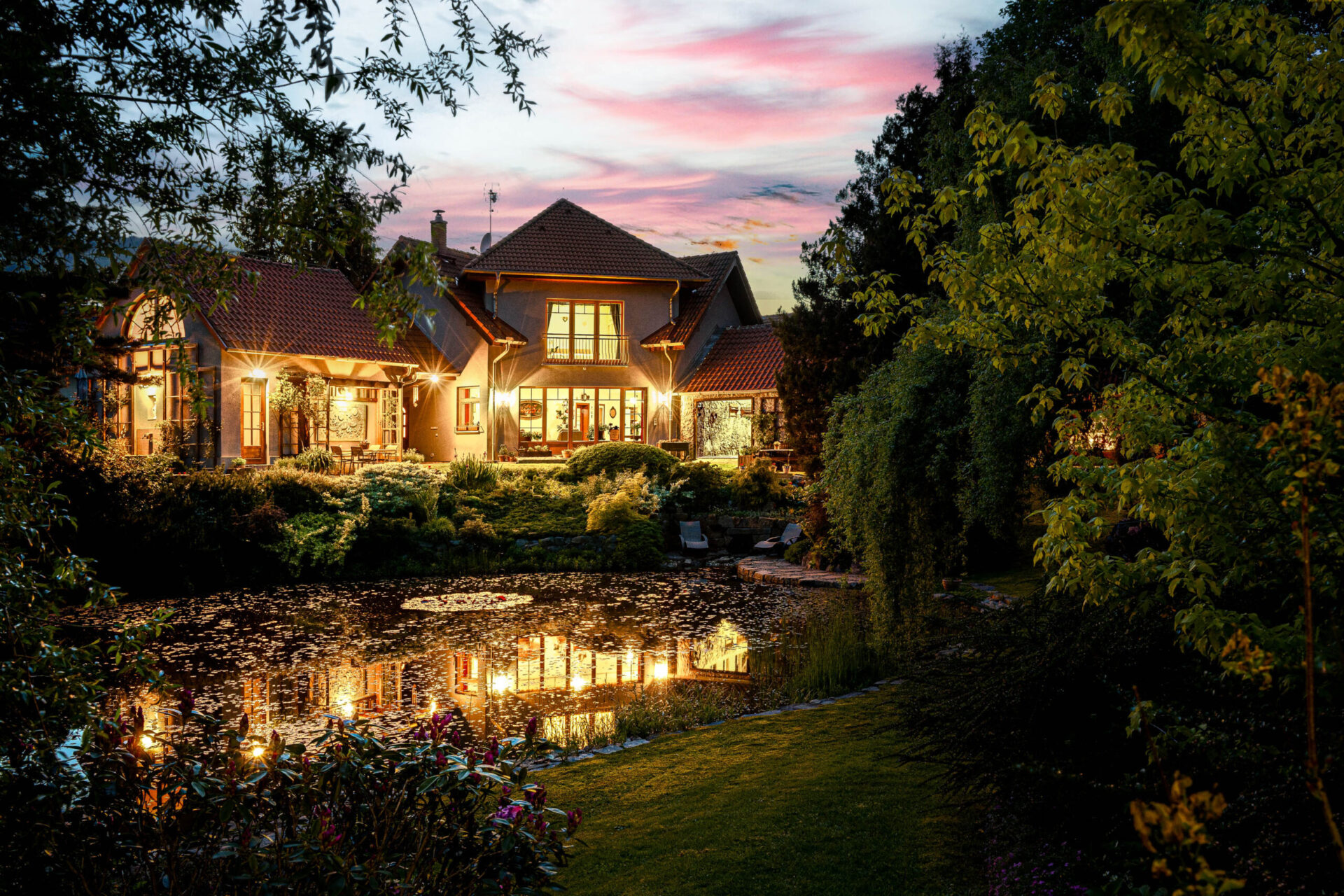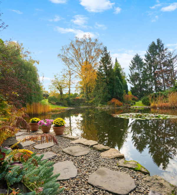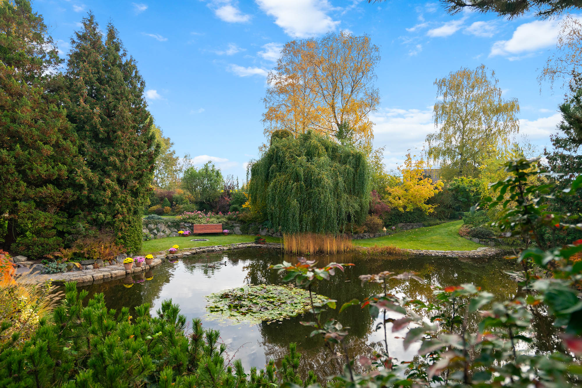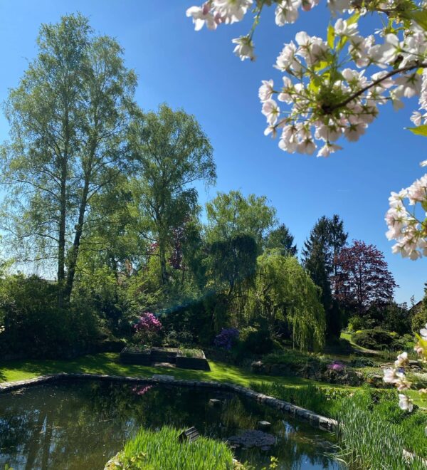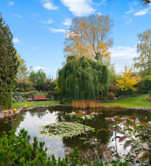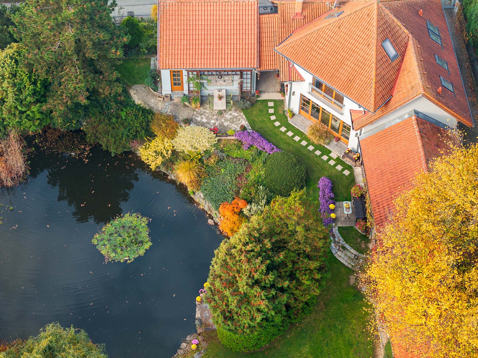 Samotná dechberoucí okrasná zahrada se vzrostlými stromy a dvěma jezírky, důmyslně založená tak, aby poskytovala maximální soukromí, doslova vybízí k odpočinku nebo k objevování skrytých zákoutí. Najdete zde prostor i pro pěstování vlastní zeleniny. A jste-li milovníky přírody, jistě vás potěší i množství živočichů, kteří zde našli své útočiště. V jarních a letních měsících se můžete zaposlouchat do ptačího zpěvu či milostného kuňkání žab. Budete-li mít štěstí, spatříte zde i ledňáčka či volavku.