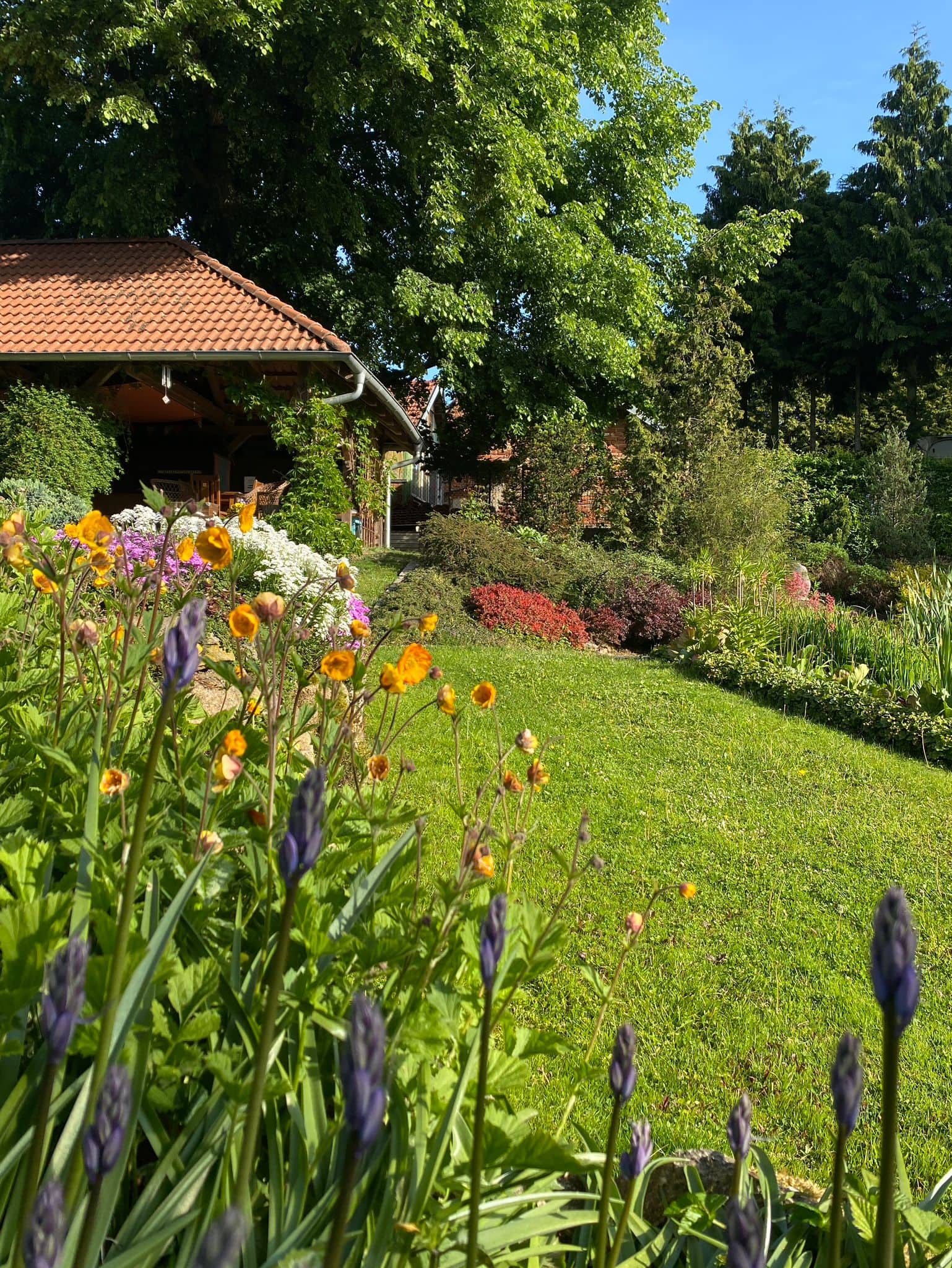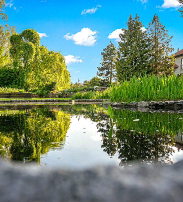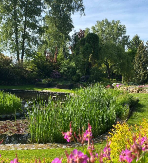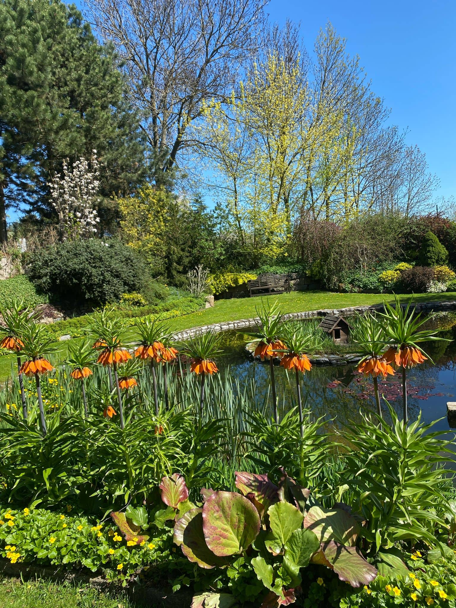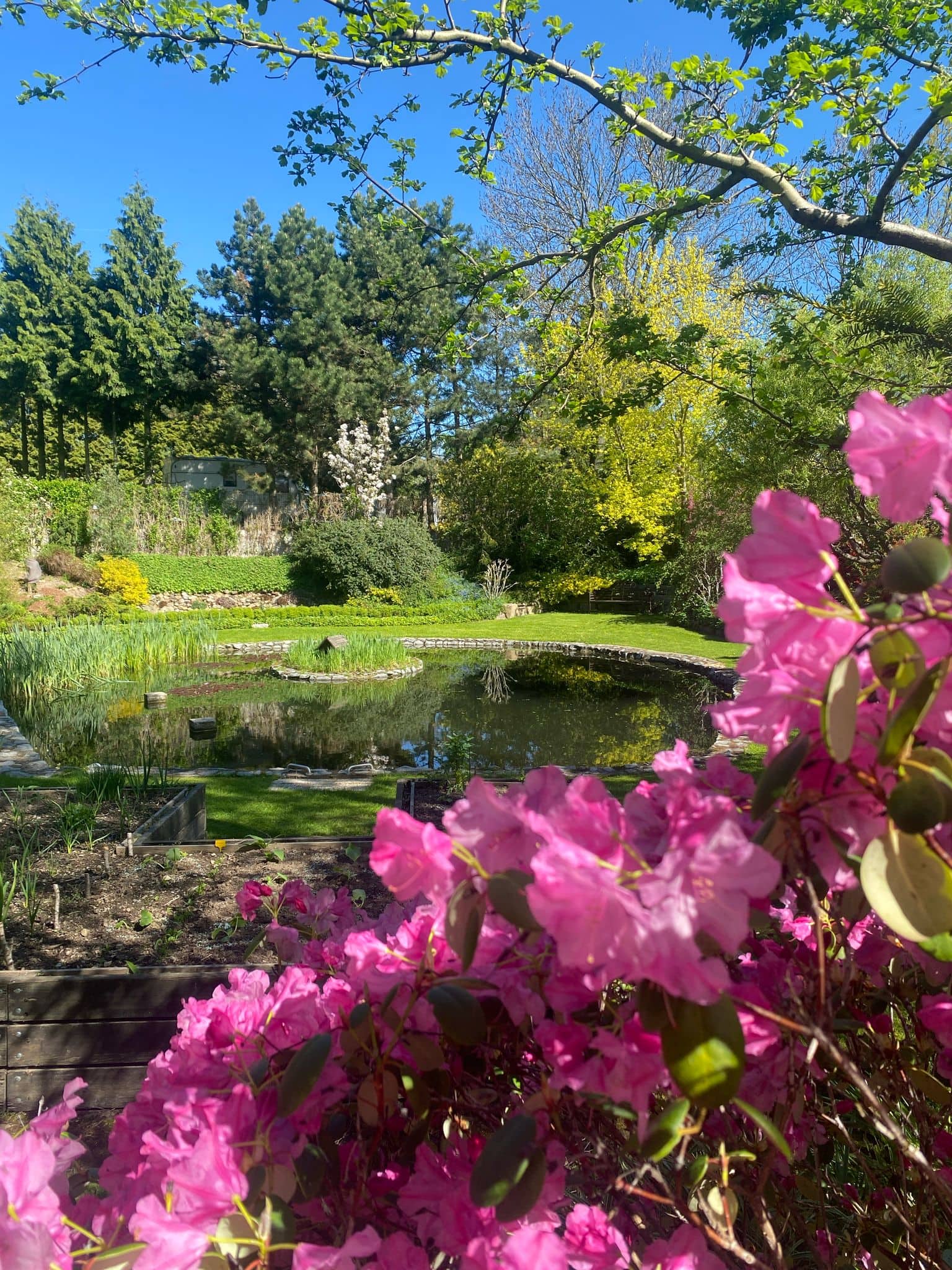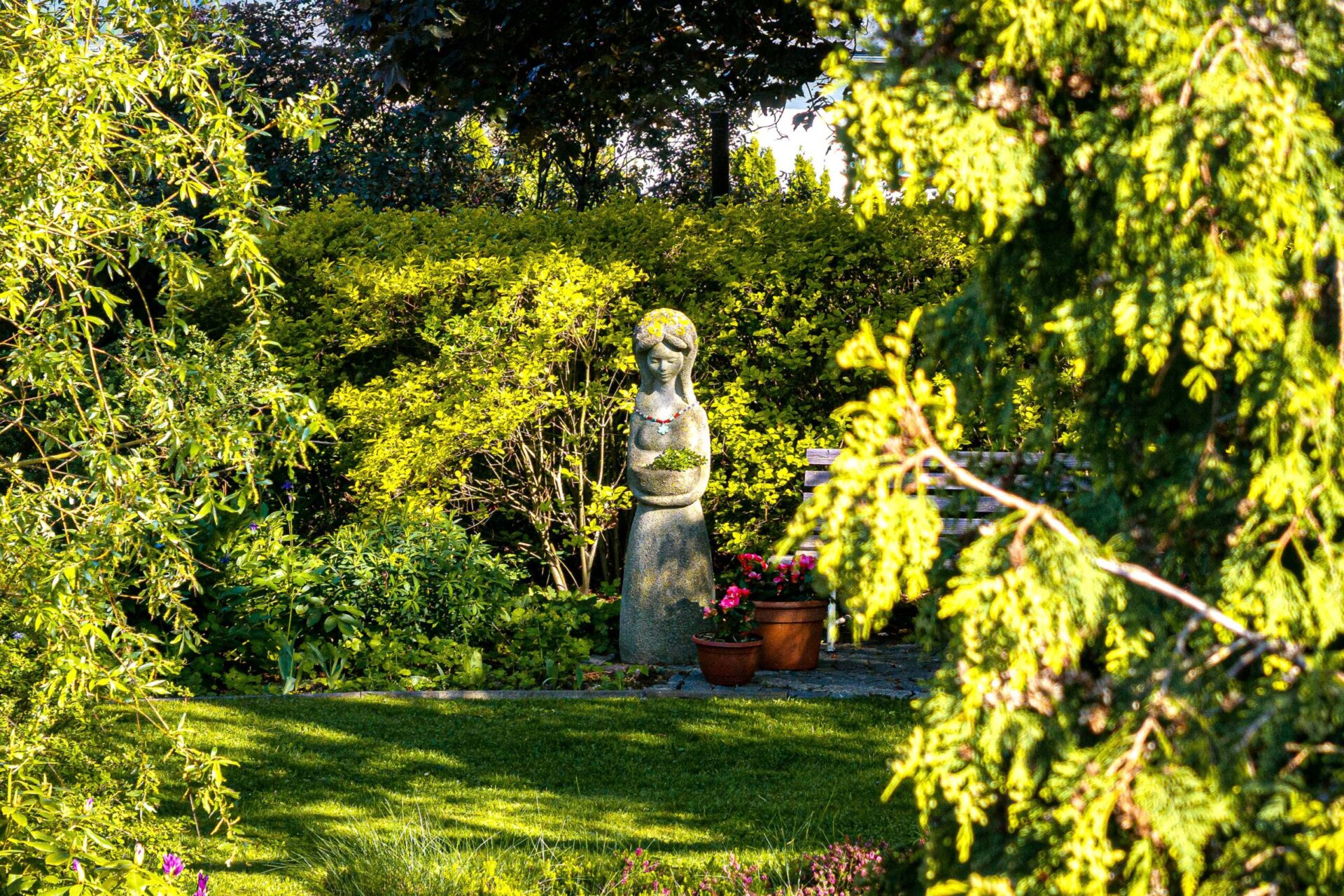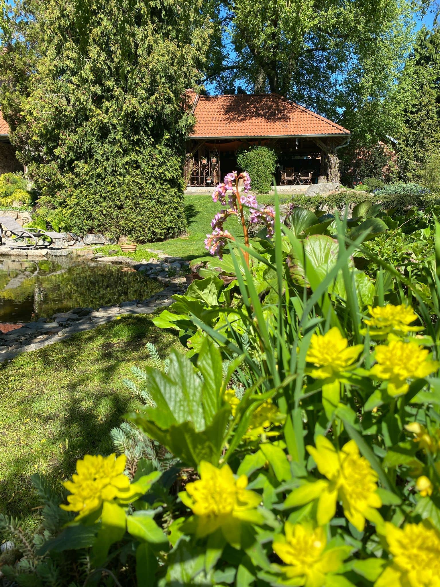 Samotná dechberoucí okrasná zahrada se vzrostlými stromy a dvěma jezírky, důmyslně založená tak, aby poskytovala maximální soukromí, doslova vybízí k odpočinku nebo k objevování skrytých zákoutí. Najdete zde prostor i pro pěstování vlastní zeleniny. A jste-li milovníky přírody, jistě vás potěší i množství živočichů, kteří zde našli své útočiště. V jarních a letních měsících se můžete zaposlouchat do ptačího zpěvu či milostného kuňkání žab. Budete-li mít štěstí, spatříte zde i ledňáčka či volavku.