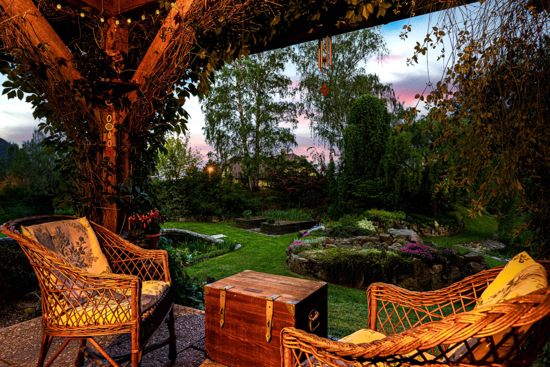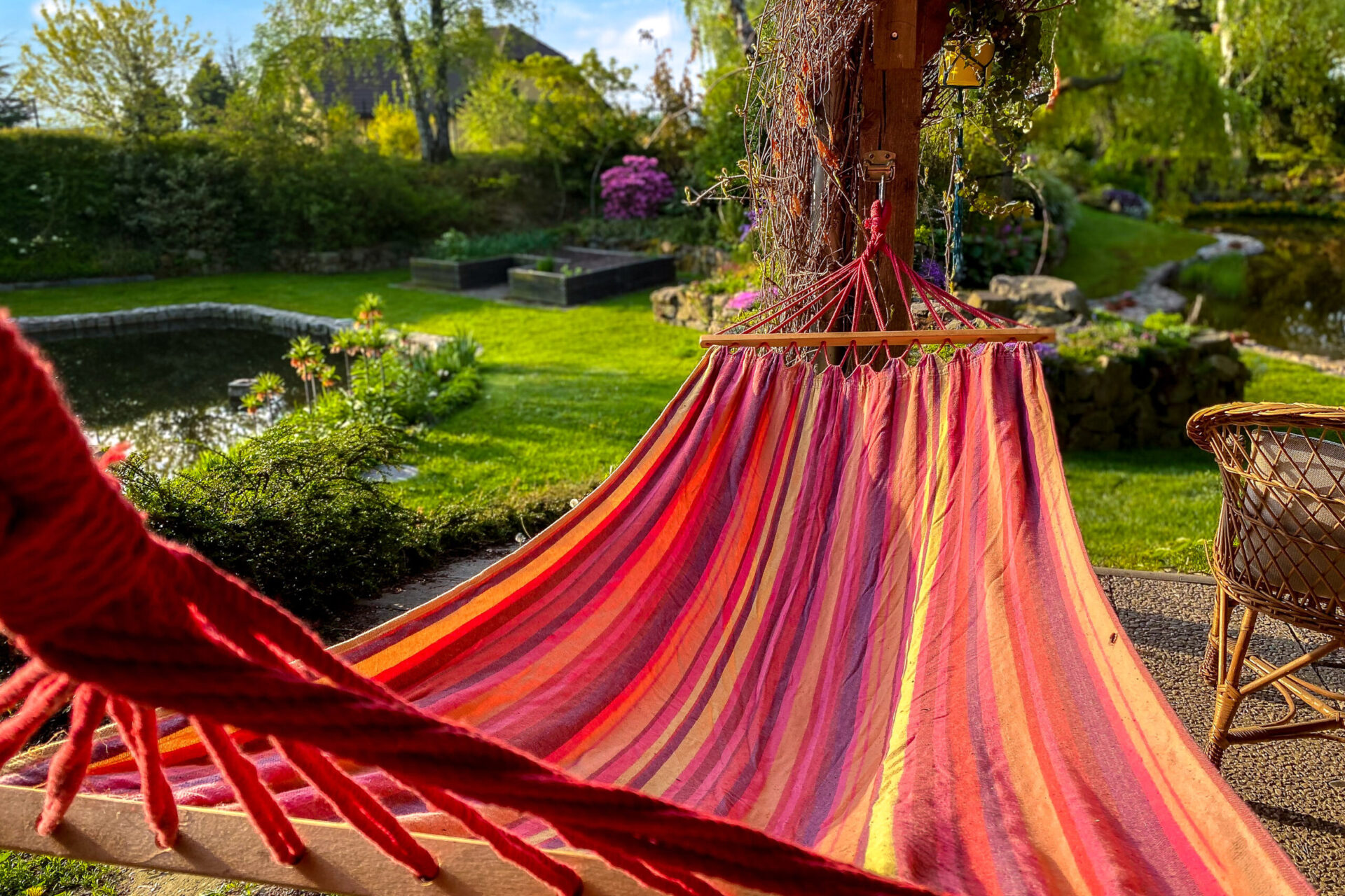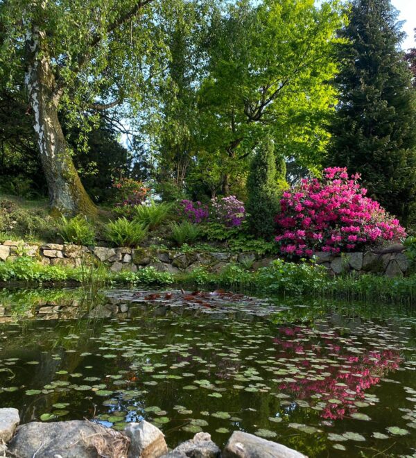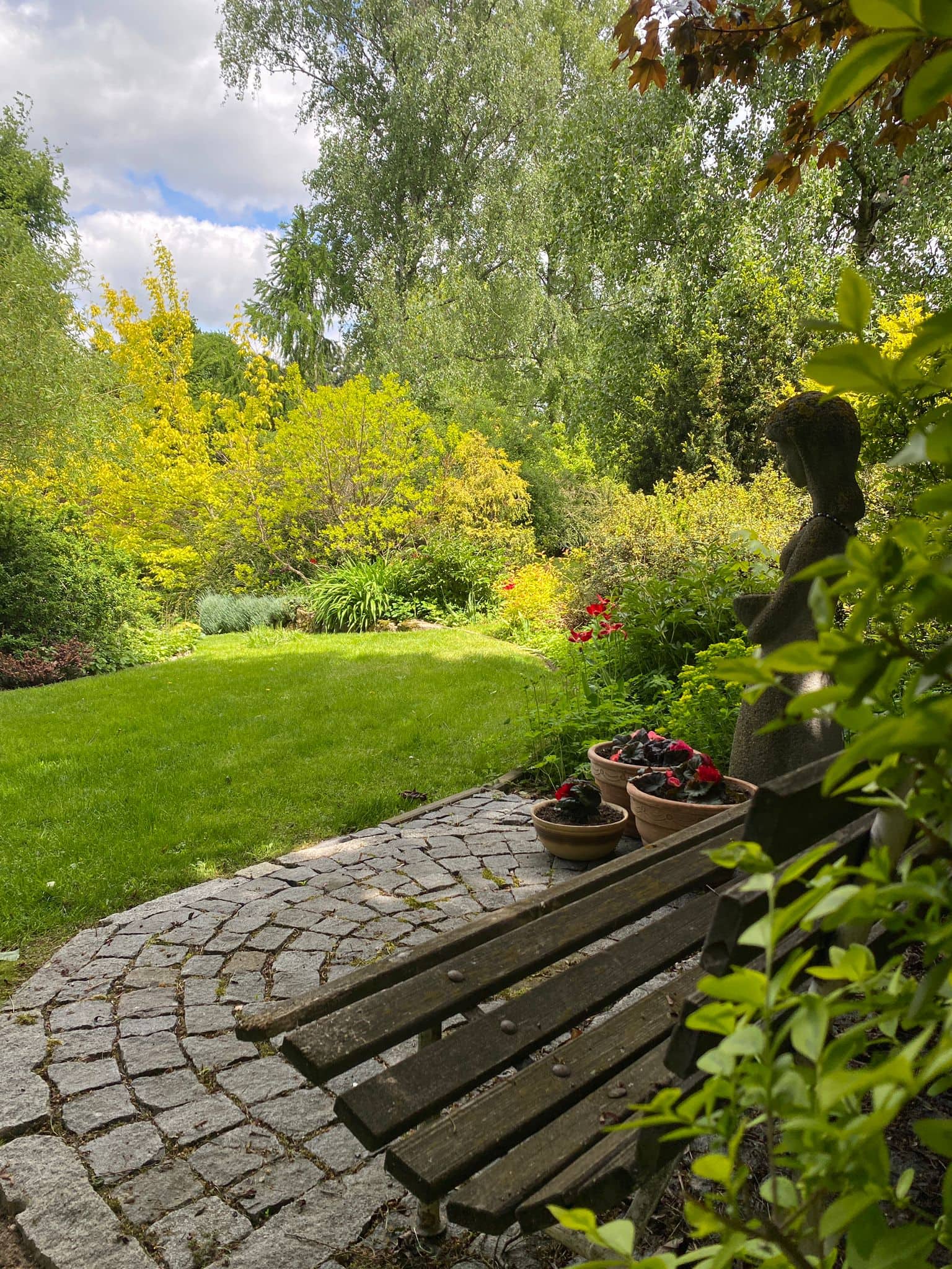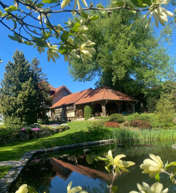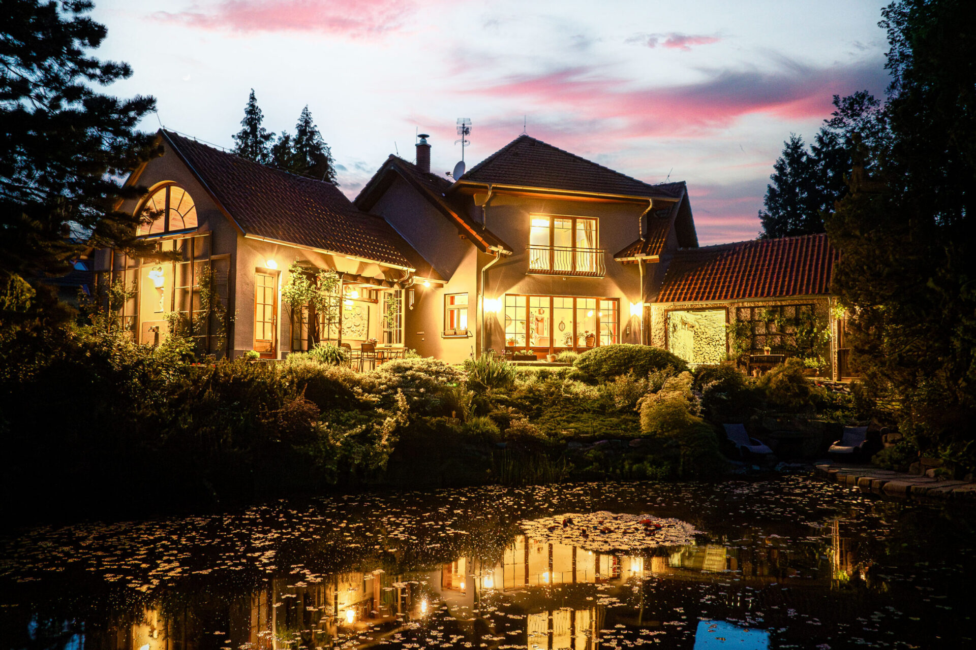 Samotná dechberoucí okrasná zahrada se vzrostlými stromy a dvěma jezírky, důmyslně založená tak, aby poskytovala maximální soukromí, doslova vybízí k odpočinku nebo k objevování skrytých zákoutí. Najdete zde prostor i pro pěstování vlastní zeleniny. A jste-li milovníky přírody, jistě vás potěší i množství živočichů, kteří zde našli své útočiště. V jarních a letních měsících se můžete zaposlouchat do ptačího zpěvu či milostného kuňkání žab. Budete-li mít štěstí, spatříte zde i ledňáčka či volavku.