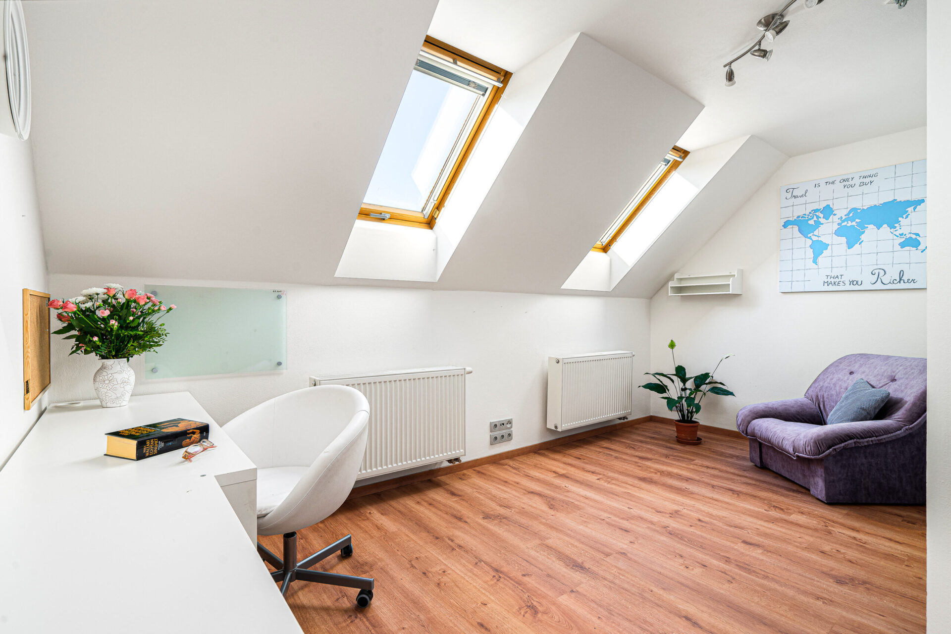 Rodinný dům o dispozici 6+kk nabízí velkorysou užitnou plochu 190 m². V přízemí naleznete předsíň, pracovnu, koupelnu s WC a prostorný obývací pokoj s kuchyňským koutem a přímým vstupem na zahradu. V patře jsou tři samostatné ložnice, koupelna s vanou a sprchovým koutem, samostatné WC a další pokoj v podkroví.